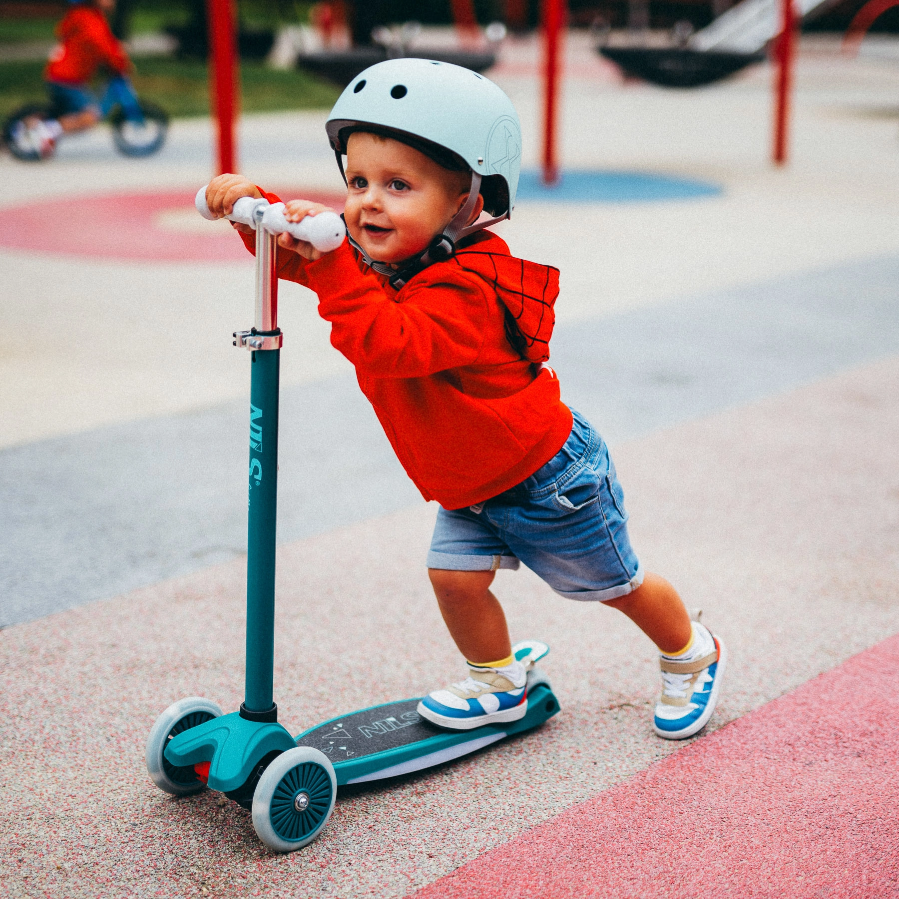 Le due ruote anteriori e lo sterzo basculante aiutano i bambini a curvare in sicurezza senza sovrasterzo del manubrio. La pedana ampia e il freno posteriore migliorano il controllo durante la guida.