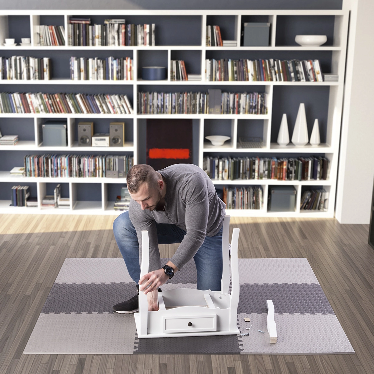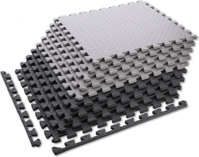 La struttura antiscivolo e testurizzata assicura stabilità durante l’allenamento, mentre la superficie impermeabile si pulisce facilmente con un panno umido. La confezione combina elementi grigio chiaro e grigio scuro per un look moderno e un montaggio versatile.