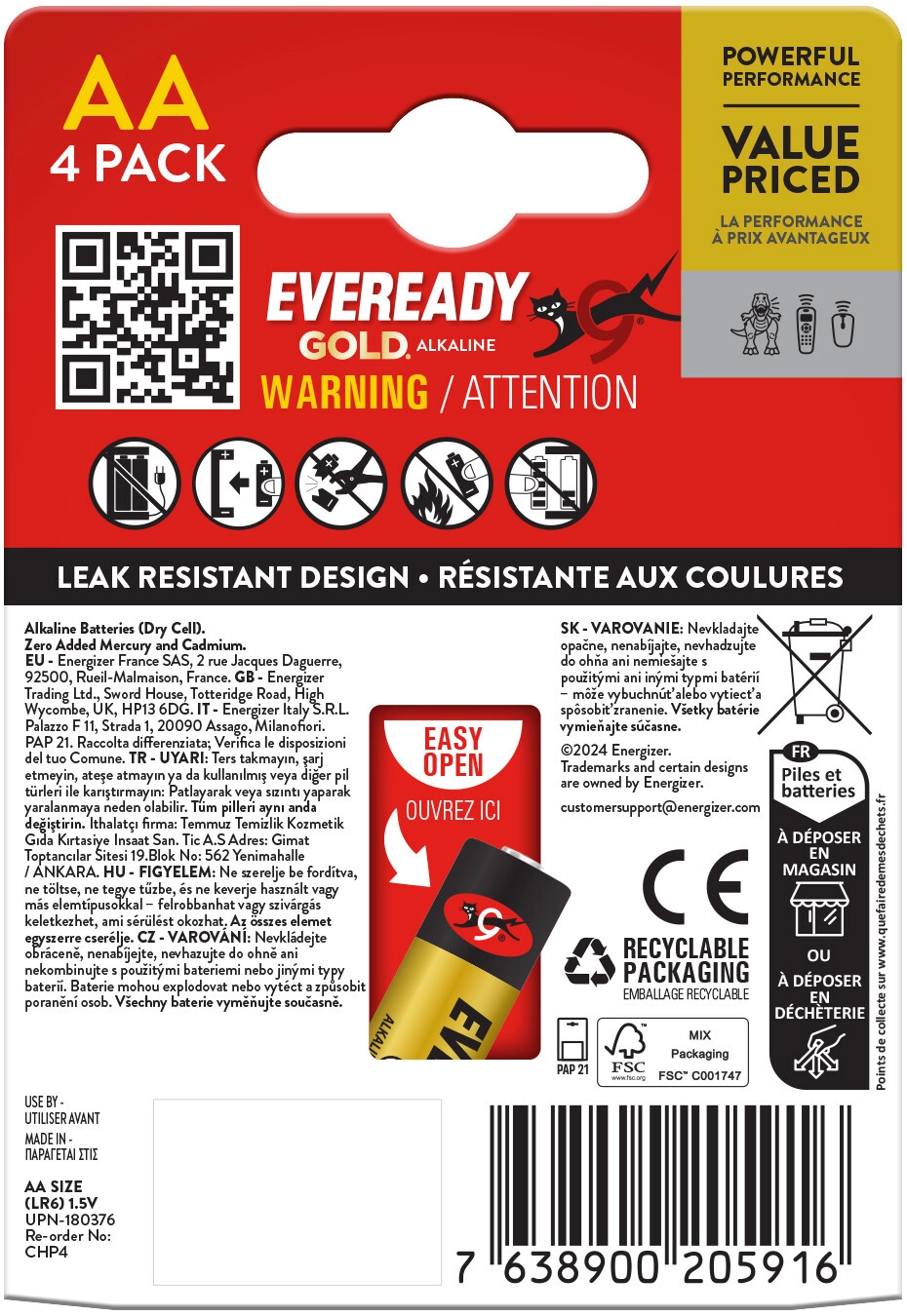 Cerchi un’alimentazione universale per l’elettronica domestica? ENERGIZER Eveready Gold in formato AA sono batterie alcaline progettate per il funzionamento affidabile di dispositivi a consumo da basso a medio. Offrono energia a lunga durata e minore autoscarica rispetto alle alternative zinco-carbone.