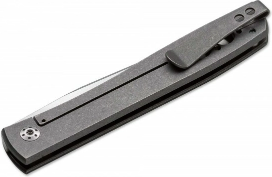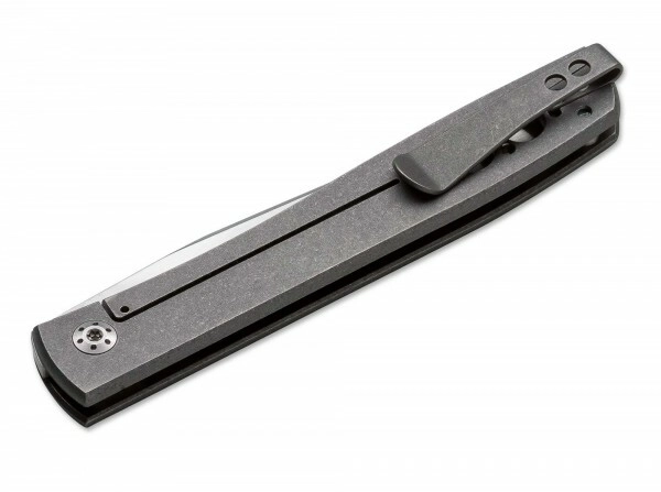 La lama si apre manualmente tramite intaglio per unghia, senza flipper, e una volta aperta è assicurata dal Framelock integrato nel manico in titanio. I fori di alleggerimento riducono il peso e migliorano la presa, mentre la clip da tasca consente un porto discreto e profondo.
