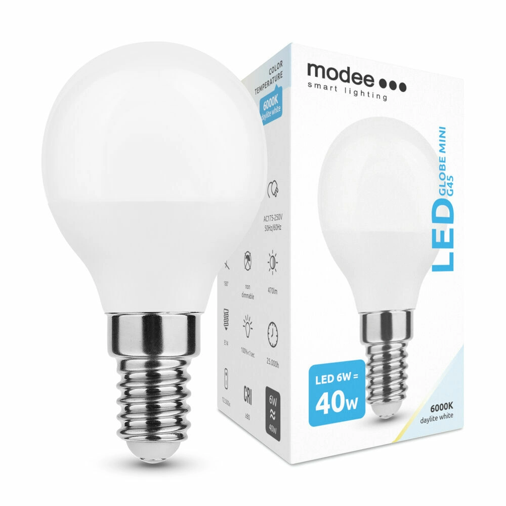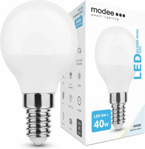 Modee LED Globe Mini G45 combina funzionamento efficiente con illuminazione di qualità. La tonalità bianco freddo 6000K è adatta a postazioni di lavoro, cucine o corridoi, dove si apprezzano luminosità e concentrazione. Grazie alle dimensioni compatte G45 è perfetta per piccoli apparecchi e lampade decorative.