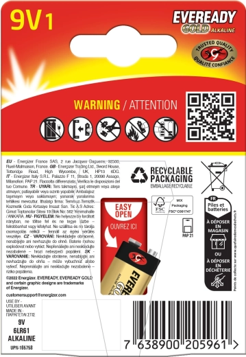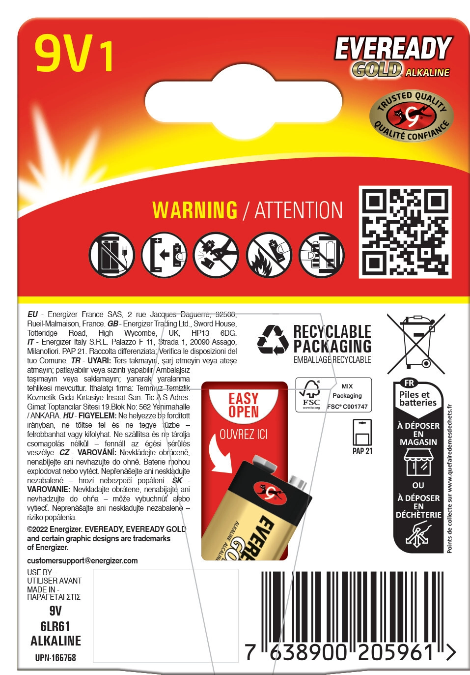Affidabile batteria alcalina ENERGIZER EVEREADY GOLD 9V per l'uso quotidiano in dispositivi a consumo energetico medio, come telecomandi, radio e giocattoli. Grazie alla tecnologia alcalina offre prestazioni stabili, lunga durata e protezione contro le perdite. Non contiene mercurio né cadmio per un funzionamento più sicuro ed ecologico.