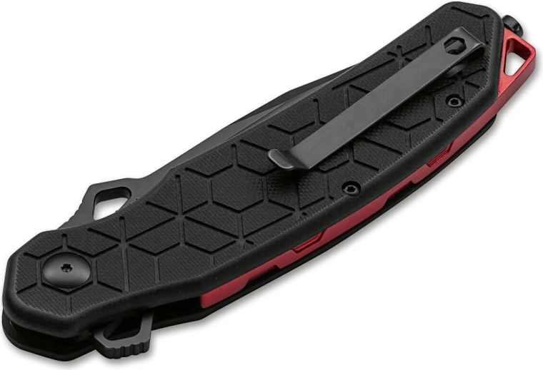 L’impugnatura ergonomica in G10 con marcata texture a nido d’ape assicura una presa sicura anche con i guanti o in condizioni bagnate. Il design è completato da un distanziale in alluminio rosso, foro per cordino, pratica clip da tasca e frangivetro integrato per le emergenze. Il coltello è fornito con un fodero in nylon di qualità, che facilita il trasporto e protegge lo strumento.