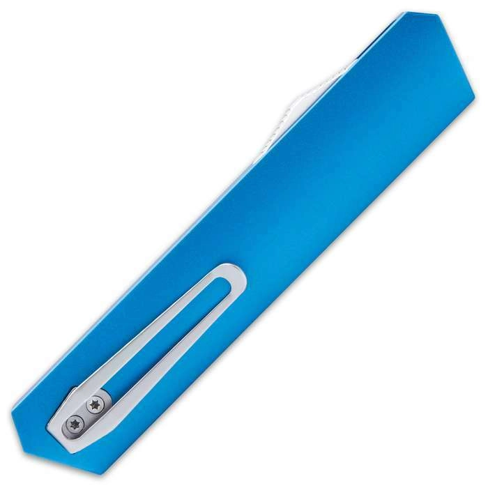 Elegante e affidabile coltello automatico Böker Plus Kwaiken OTF Blue con lama a estrazione frontale in acciaio D2, caratterizzato da design minimalista, lavorazione precisa e meccanismo a slitta rapido. La impugnatura in alluminio leggera di colore blu, la clip da tasca e la custodia in nylon lo rendono una scelta ideale per il trasporto quotidiano.