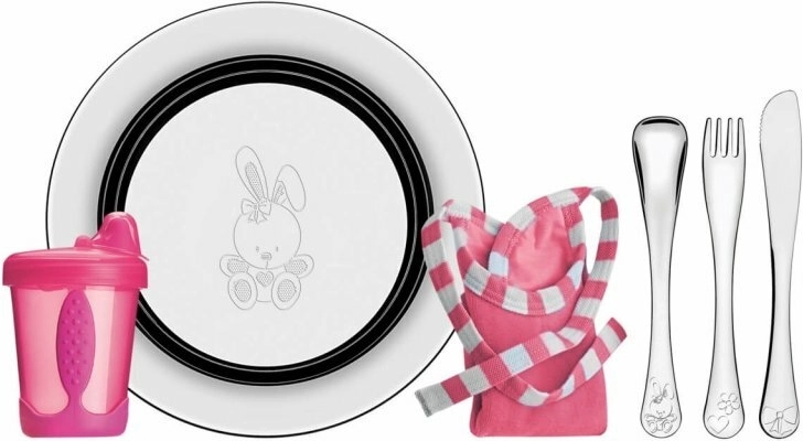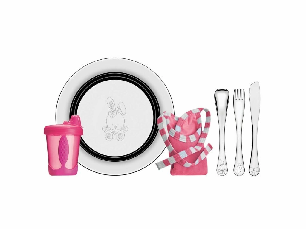 Il carinissimo e pratico set da tavola per bambini Tramontina Le Petit in colore rosa offre tutto ciò di cui un piccolo commensale ha bisogno. Include posate in acciaio inox (forchetta, cucchiaio e coltello), piatto in acciaio inox, un morbido bavaglino e un bicchiere di plastica richiudibile da 200 ml in polipropilene senza BPA. Le maniglie allegramente decorate favoriscono l’autonomia a tavola e una facile manutenzione.