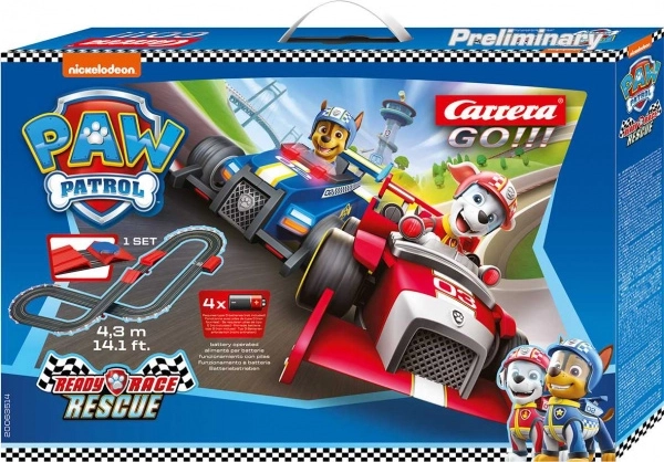 Divertente pista CARRERA GO con tema Paw Patrol offre ai bambini dai 5 anni un circuito lungo 4,3 m con le macchinine di Chase e Marshall. Il set include salto, ponte, rettilinei e curve e alimentazione a batterie con possibilità di acquistare un trasformatore. Compatibile con auto e parti GO!!! per ancora più divertimento.