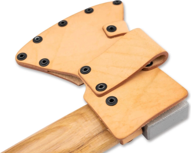 I doppi cinghietti con bottoni a pressione metallici bloccano la testa dell’ascia e la mantengono salda anche in movimento.