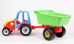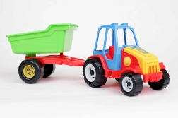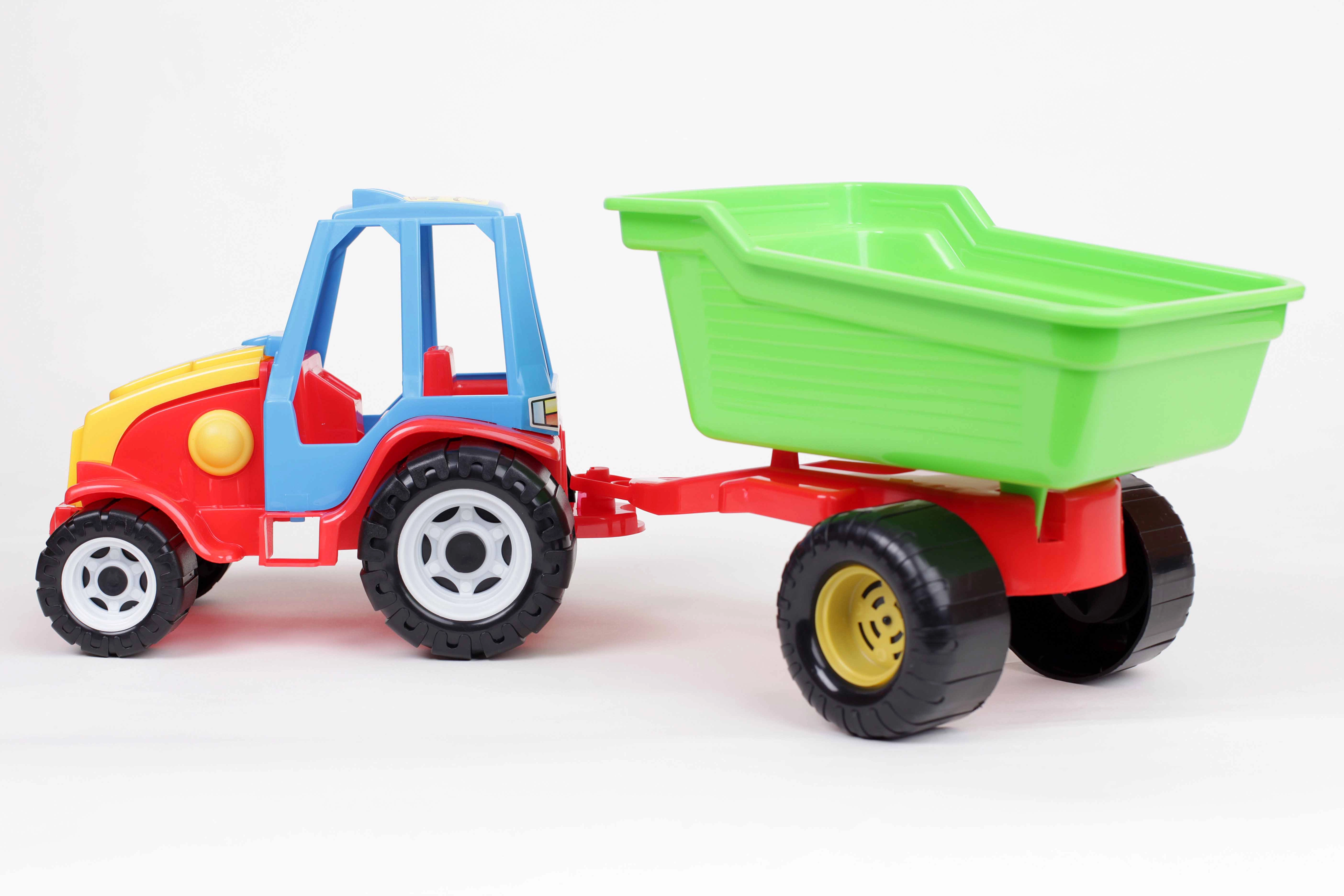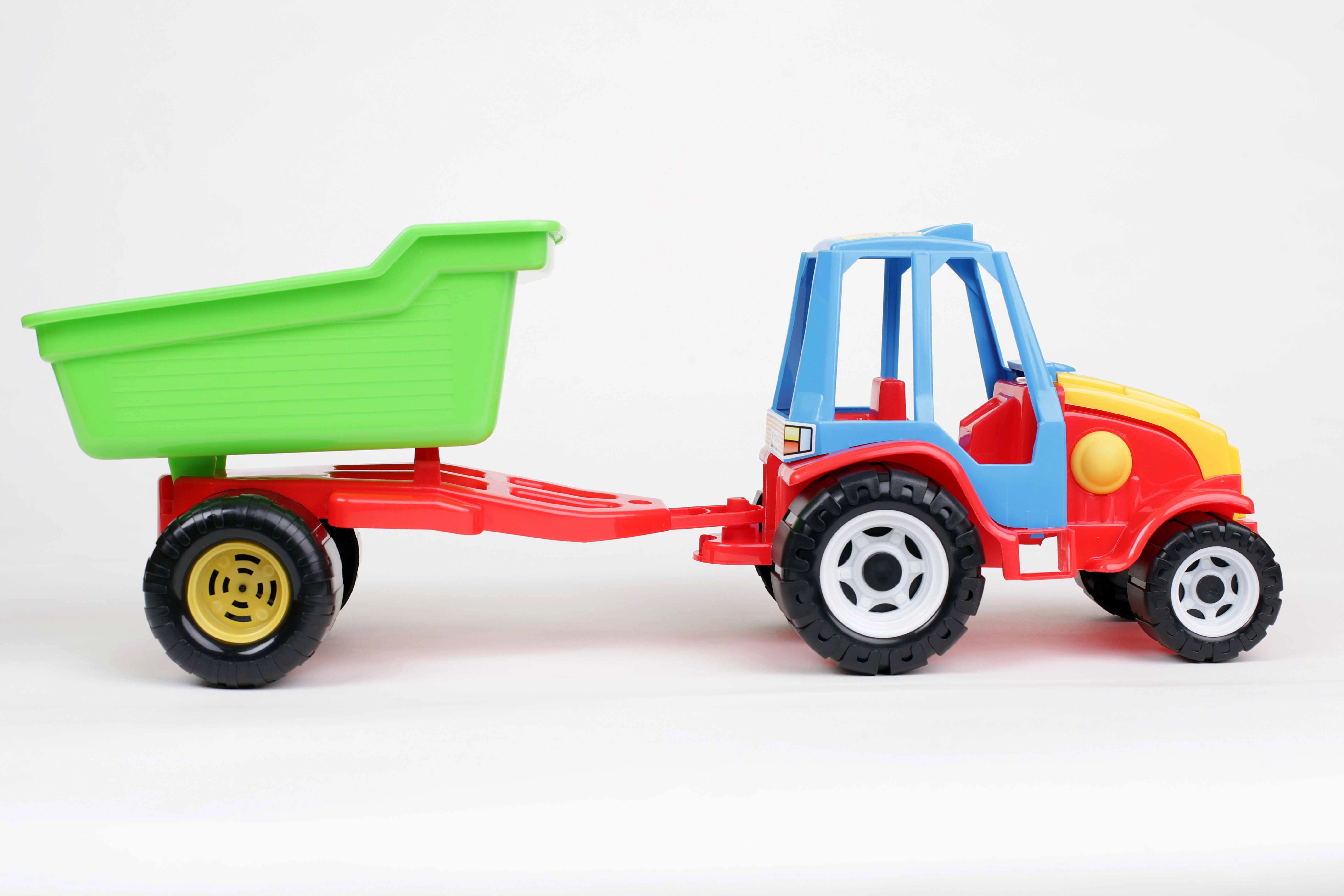 Colorato trattore in plastica con rimorchio rimovibile e ribaltabile che farà felici i piccoli costruttori a casa, sulla sabbia e in spiaggia. Ruote robuste, facile manovrabilità e materiali sicuri privi di metalli pesanti garantiscono ore di gioco creativo e divertimento in sicurezza.