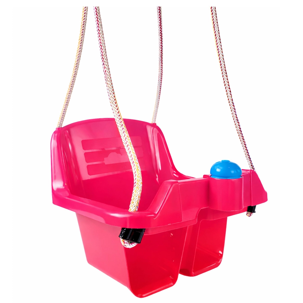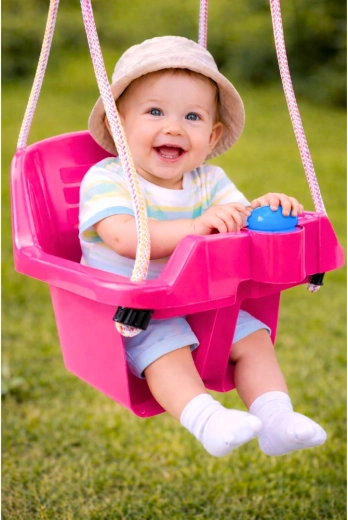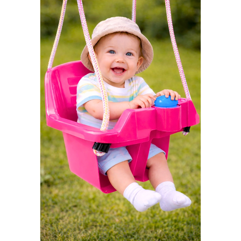 Questa altalena rosa per bambini è progettata per un dondolio sicuro e piacevole già da circa 10 mesi di età. Il sedile profondo a secchiello e lo schienale alto mantengono il bambino nella posizione corretta, mentre la barra anteriore impedisce lo scivolamento. Grazie alle corde robuste è adatta sia alla sospensione in interni che all’aperto in giardino.