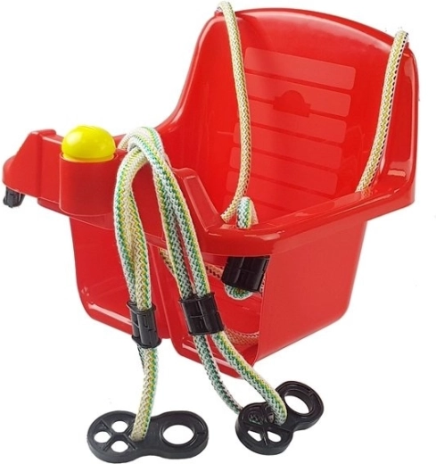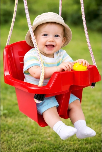Sicura altalena rossa a secchiello per i più piccoli con alto schienale, barra di protezione anteriore e solido sistema di sospensione. Offre un sedile profondo, un supporto stabile per la schiena e plastica resistente adatta al giardino e agli interni. Inclusa una divertente trombetta che farà felice ogni bebè.