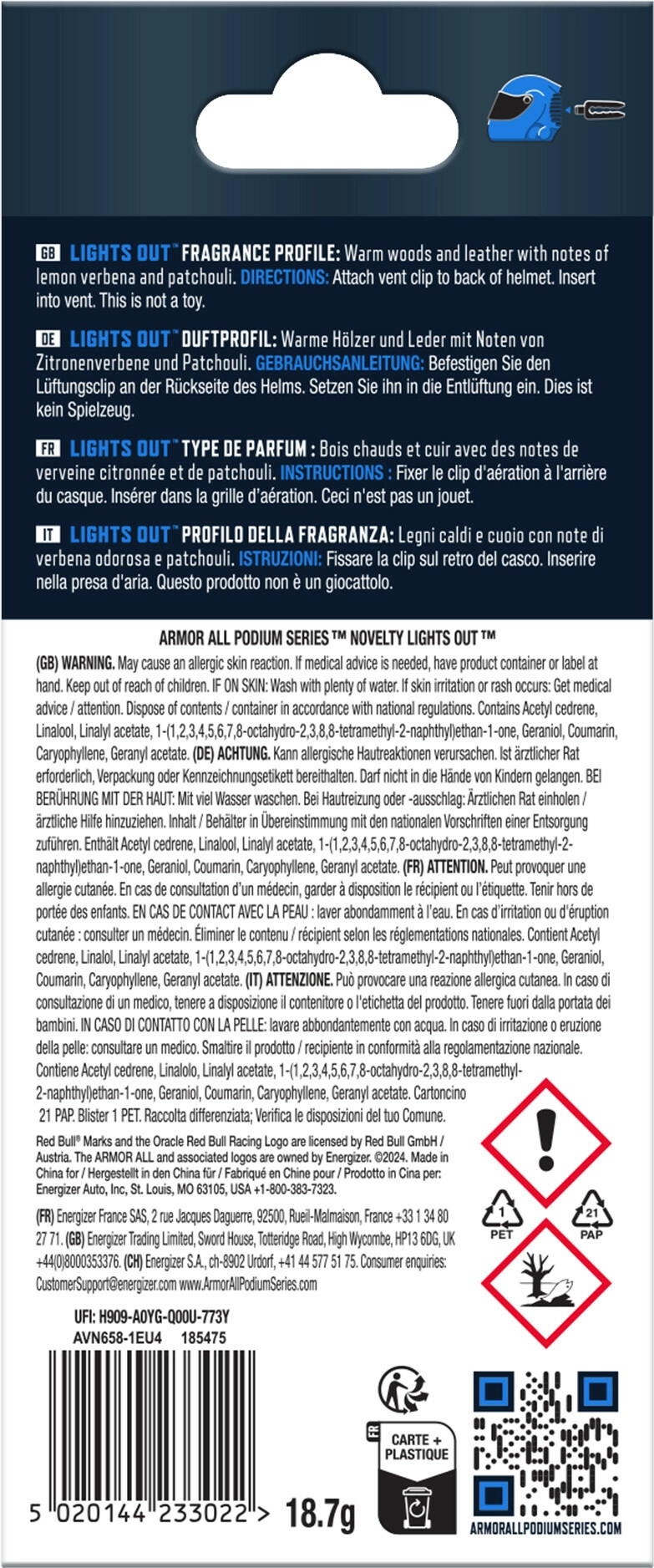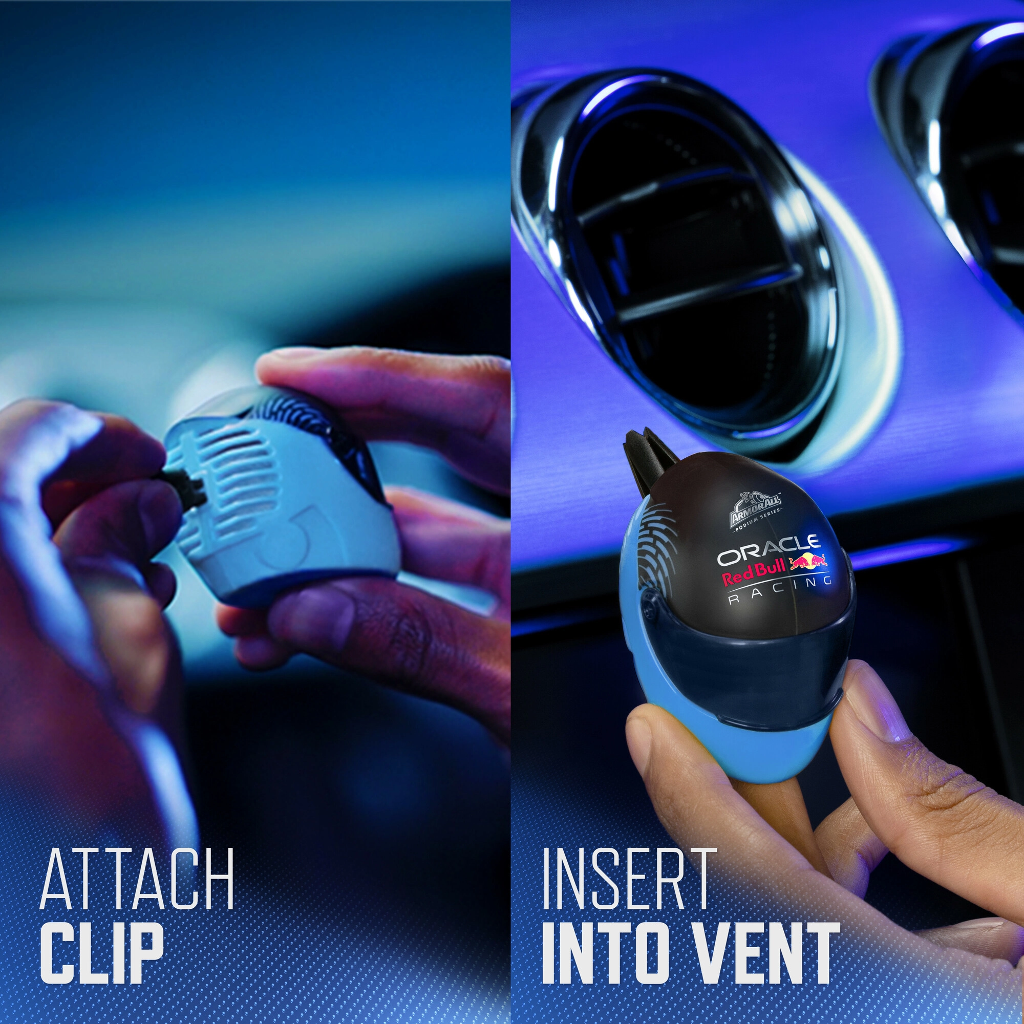L'elegante profumatore auto 3D Armor All Oracle Red Bull Lights Out Helmet Vent offre una fragranza intensa e duratura in un design iconico ispirato a ORACLE RED BULL RACING. Si fissa facilmente alla maggior parte delle bocchette di ventilazione, offre intensità regolabile e rinfresca immediatamente l’abitacolo con una combinazione di legni caldi, pelle, verbena al limone e patchouli.