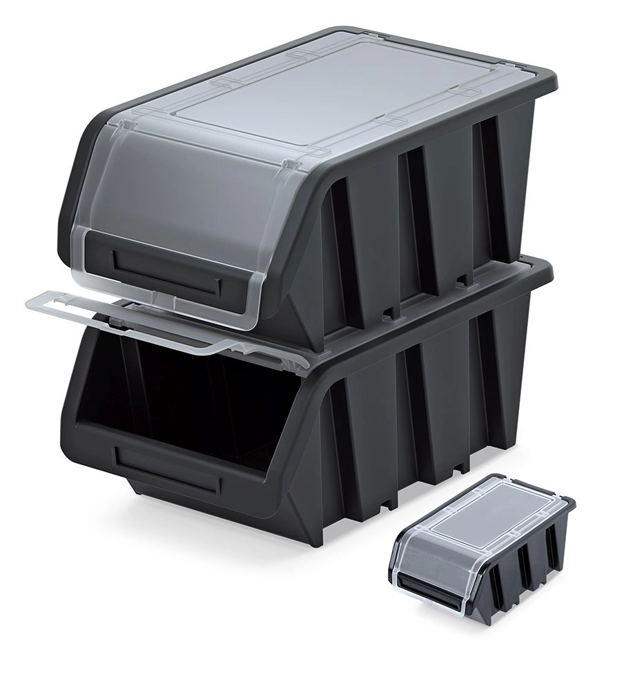 Grazie alla struttura impilabile e alla possibilità di montaggio a parete sfrutti al meglio ogni centimetro di spazio. Il composto polimerico resistente garantisce lunga durata e affidabilità anche con uso frequente in ambienti impegnativi come officine e magazzini.