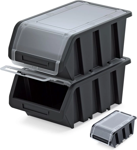 Pratica scatola portaoggetti in plastica con coperchio trasparente richiudibile, ideale per riporre in modo ordinato utensili, minuteria e piccoli oggetti in officina o in garage. Grazie alla struttura resistente, al design impilabile e alla possibilità di appendere a parete, fa risparmiare spazio e garantisce un accesso rapido al contenuto senza dover aprire il coperchio.