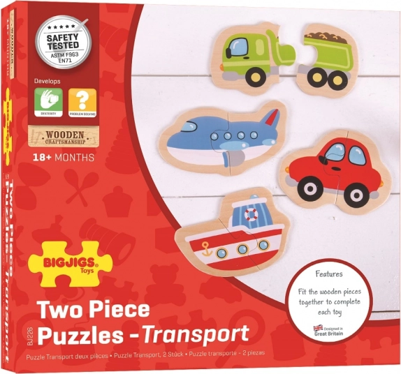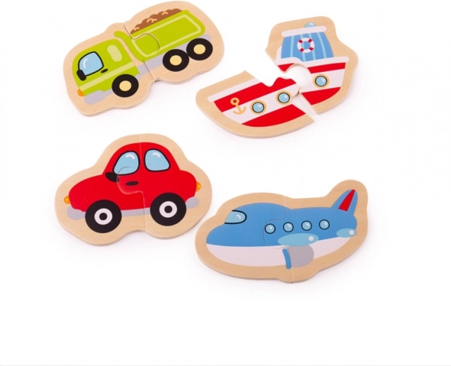 Questo set di puzzle in legno presenta quattro mezzi di trasporto molto amati, che i bambini possono comporre facilmente con due pezzi robusti. Forme semplici, colori vivaci e una piacevole finitura in legno invitano a giocare ripetutamente e favoriscono in modo naturale lo sviluppo del linguaggio, il riconoscimento di forme e colori e la concentrazione.