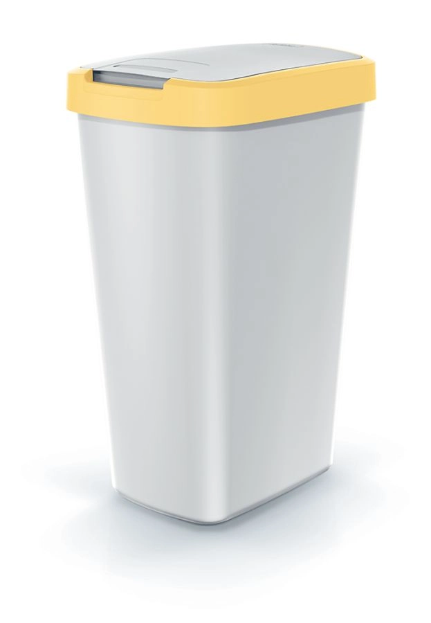 Pratica pattumiera da 45 l in moderno colore cenere con coperchio giallo chiaro, ideale per case e uffici. Grazie alla forma stretta si inserisce facilmente negli spazi ridotti, il coperchio a sportellino con due modalità di apertura garantisce un utilizzo comodo e igienico e il bordo estetico mantiene saldamente il sacchetto in posizione. Il plastica resistente consente una manutenzione semplice e una lunga durata.