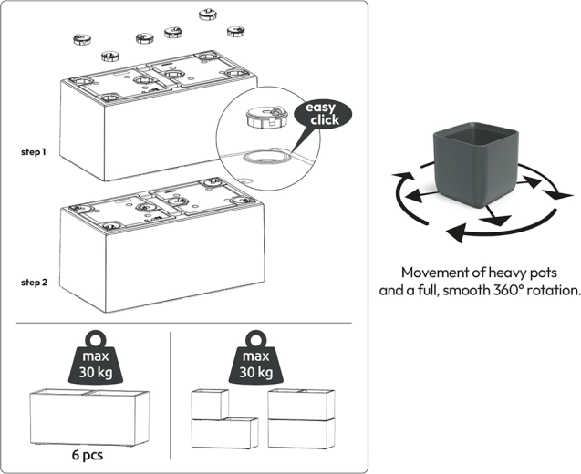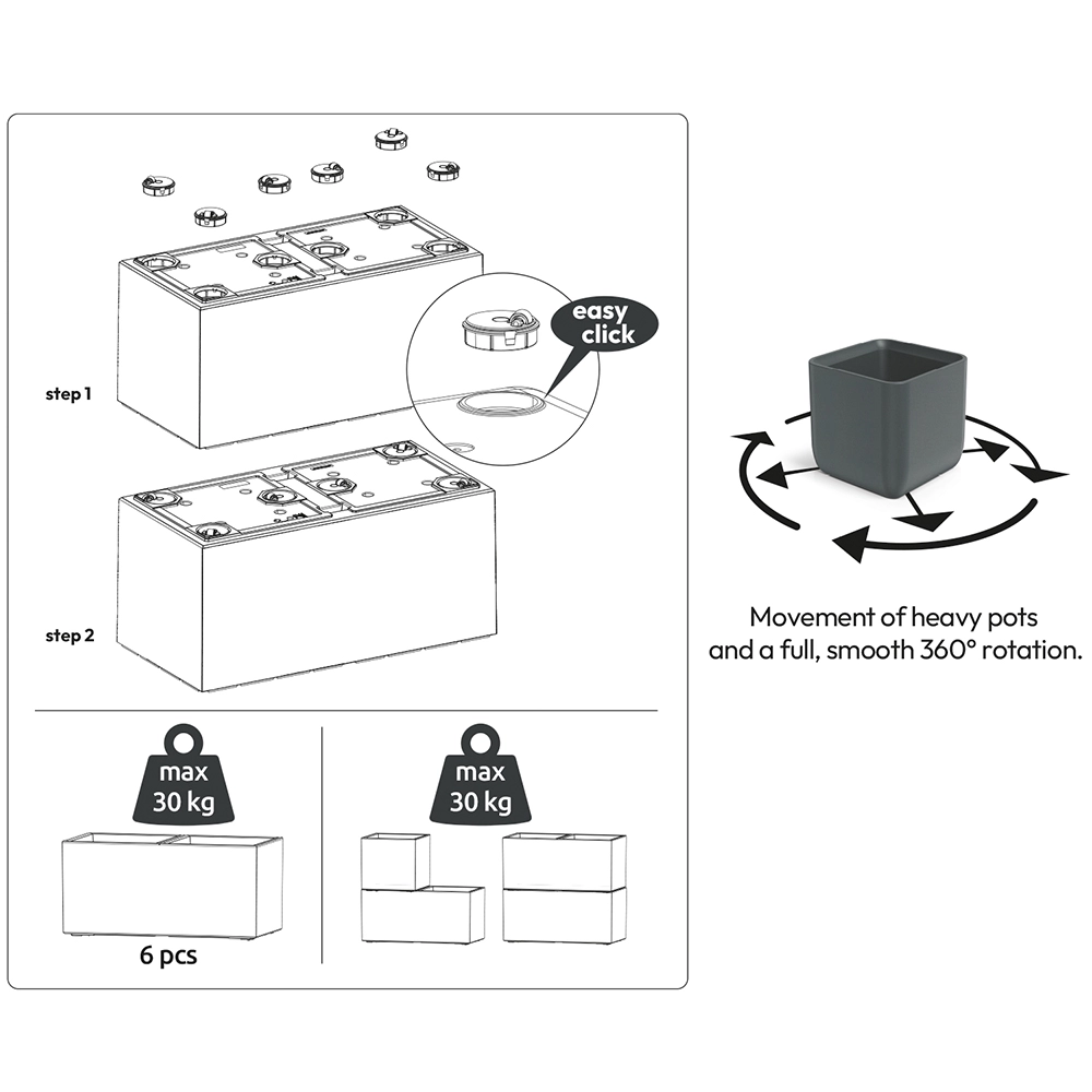 Il sistema autoirrigante integrato mantiene l’umidità ideale del substrato, così le piante prosperano anche con annaffiature meno frequenti. I piedini con effetto legno assicurano stabilità, migliore areazione del fondo e un aspetto elegante sia in terrazza che in salotto.