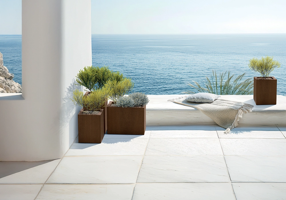 La forma minimalista e squadrata nel tono marrone ruggine si abbina perfettamente ai materiali naturali e valorizza il verde su balcone, terrazza e in soggiorno.