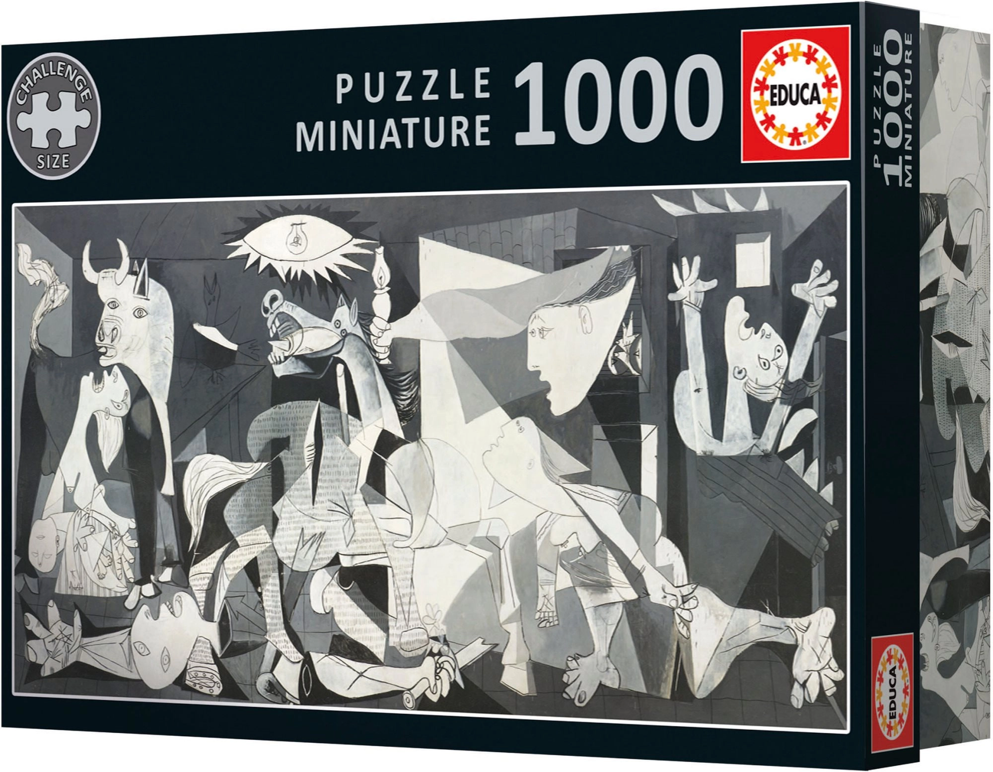 Scopri un’icona dell’arte moderna in un formato compatto e coinvolgente: il puzzle panoramico in miniatura Guernica (Pablo Picasso) di EDUCA con 1000 pezzi e colla inclusa gratuitamente. Grazie ai pezzi mini da circa 1,2 cm potrai completare l’intero panorama anche in poco spazio: l’immagine finale misura 62,5 × 30 cm.