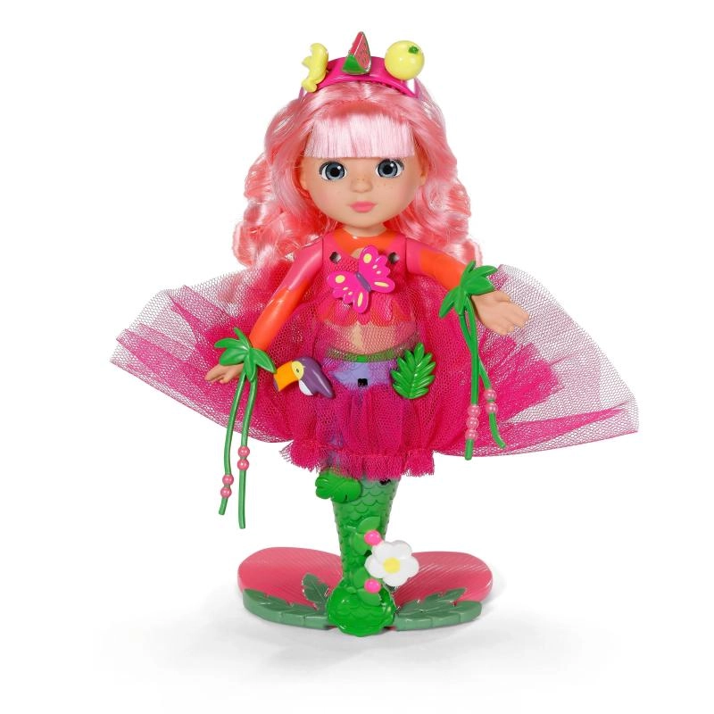 Entra nel scintillante mondo di BABY born Glam Up! Sunshine è una sirena che ama le trasformazioni – dall’acconciatura fino alla pinna. Grazie ai lunghi capelli rosa con magico effetto UV creerai ogni volta un look diverso e al sole vivrai un vero momento wow. Gli accessori tessili inclusi, le decorazioni colorate a clip e il tenero mini animaletto con pinna removibile aprono ai bambini un mondo di styling fantasioso e di storie da inventare.