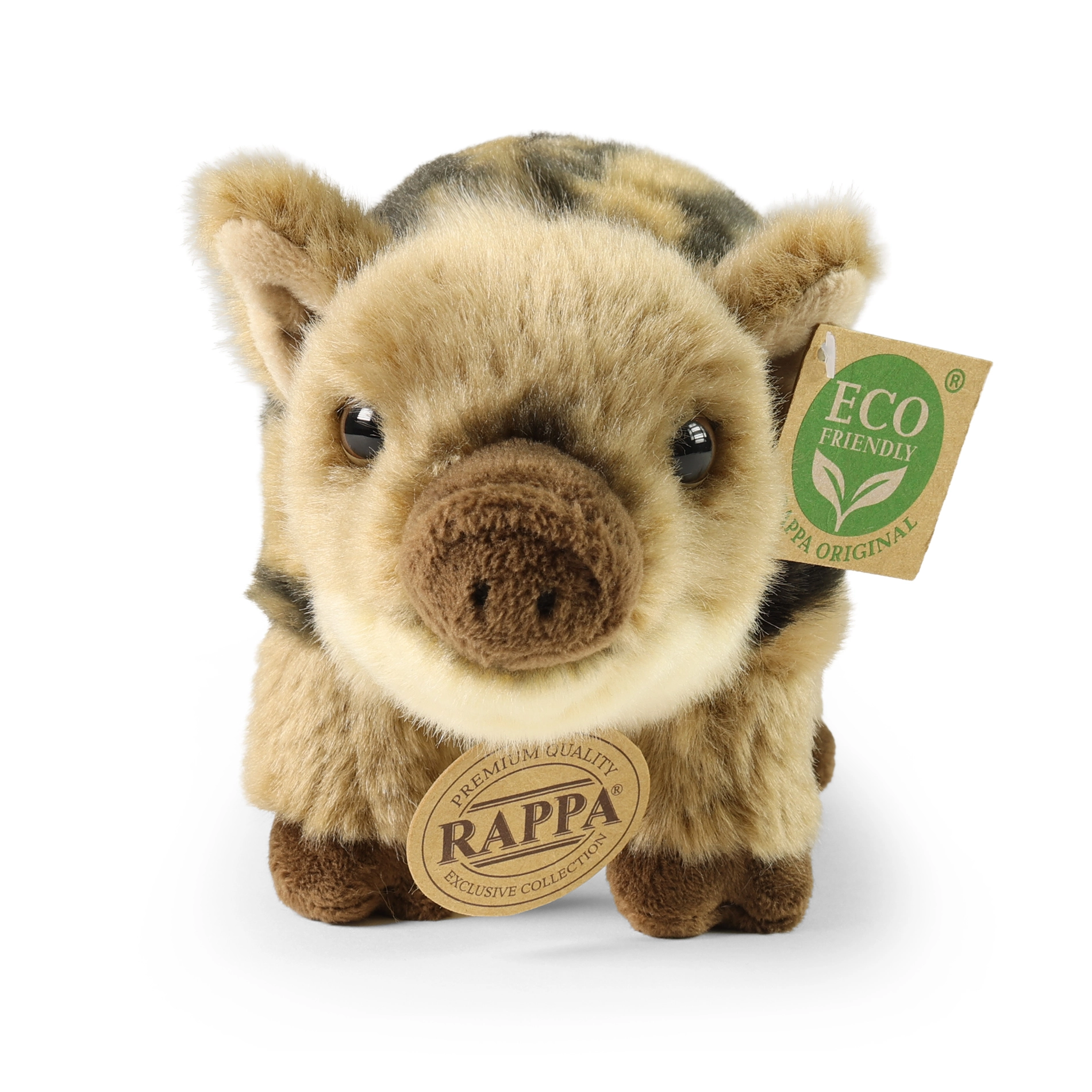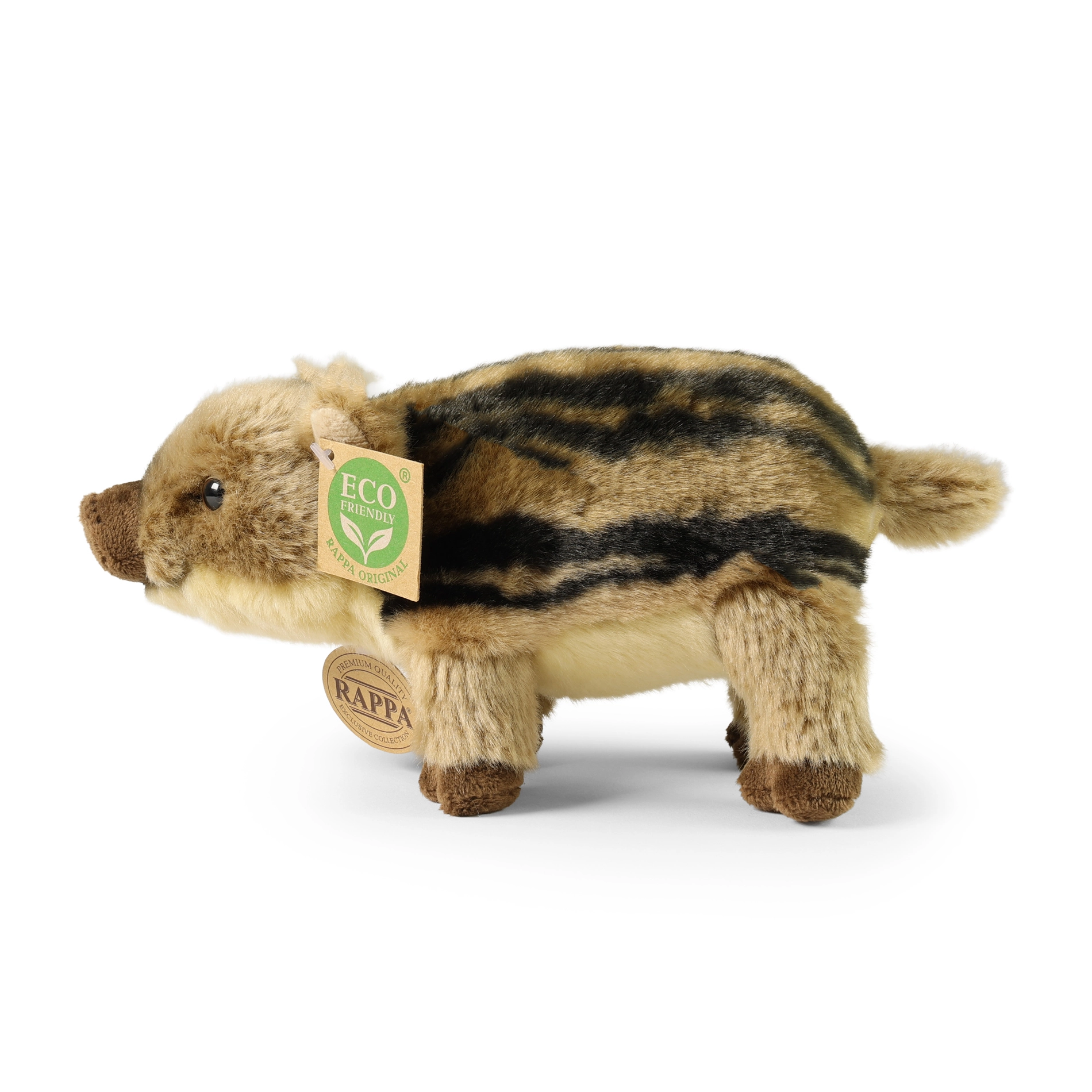 Adorabile maialino di cinghiale in peluche lungo 21 cm della collezione premium RAPPA: conquista con la sua morbidezza, l'aspetto realistico e la lavorazione rispettosa della natura. L'imbottitura è realizzata con materiali riciclati, rendendo il giocattolo non solo eco friendly, ma anche sicuro per i bambini fin dalla nascita. Perfetto per coccole e gioco, con lavorazione manuale per dettagli massimamente autentici.
