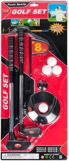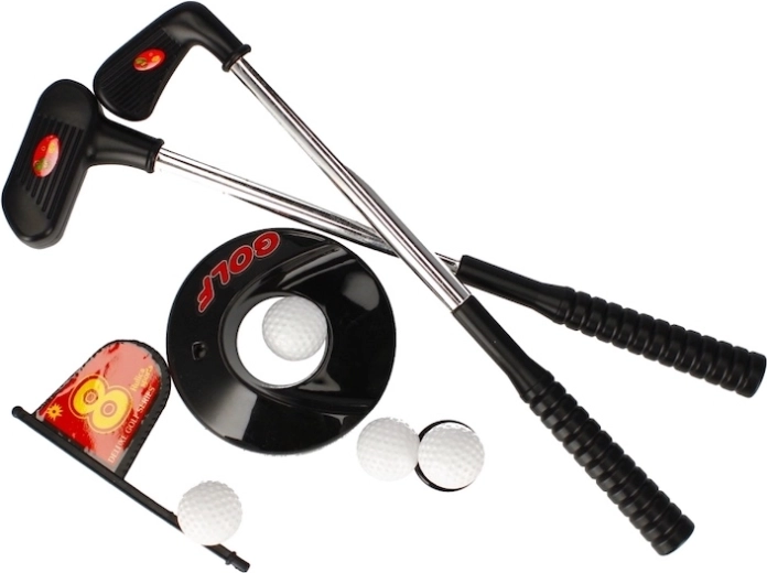 La confezione include due diverse mazze da golf per un gioco vario, tre palline resistenti, una buca con bandierina e una piccola rampa/bersaglio per un putting divertente. Il set è ideale per fratelli o amici e favorisce il movimento attivo senza schermi.