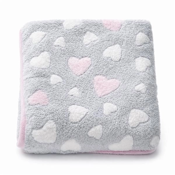 La soffice copertina rosa con cuoricini è un accessorio pratico e di stile per il corredo, che farà felici sia i genitori sia il bambino.