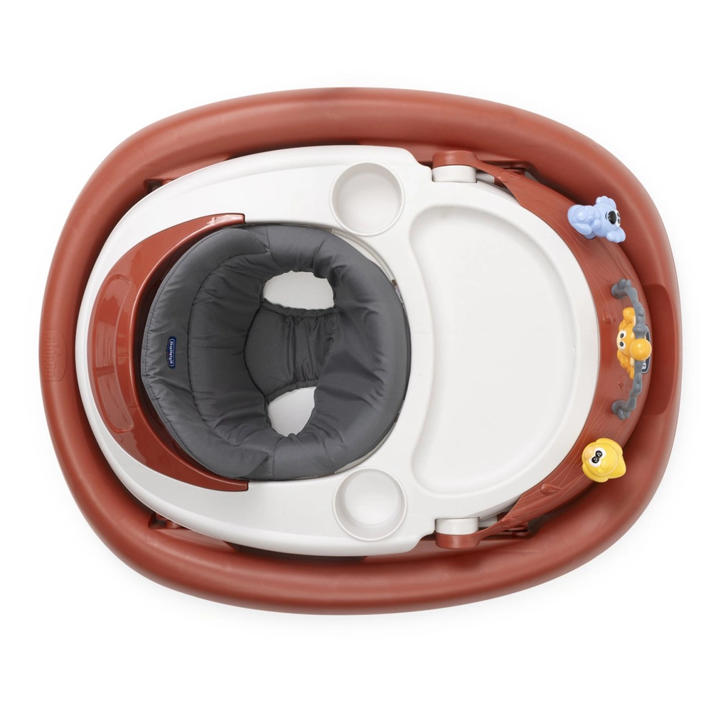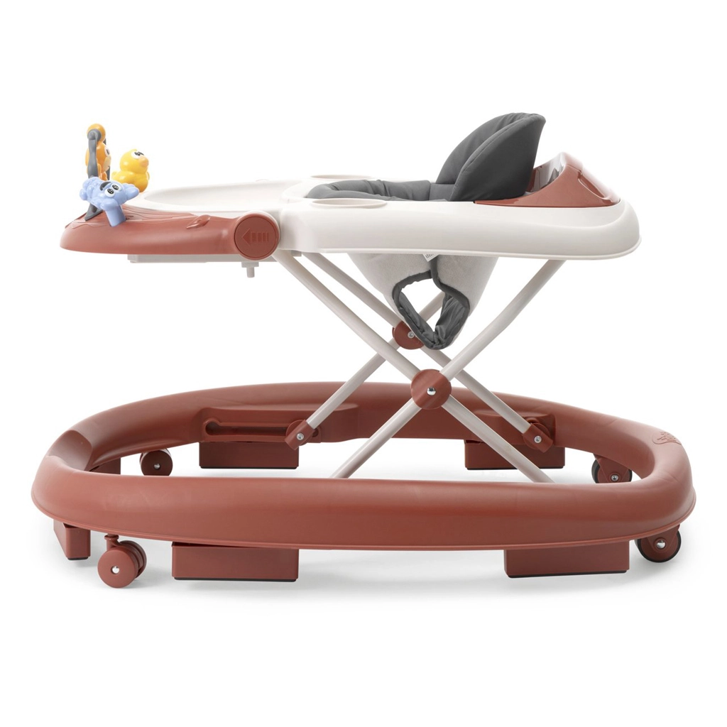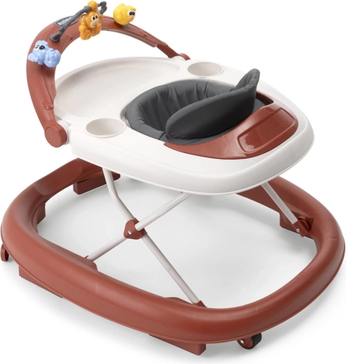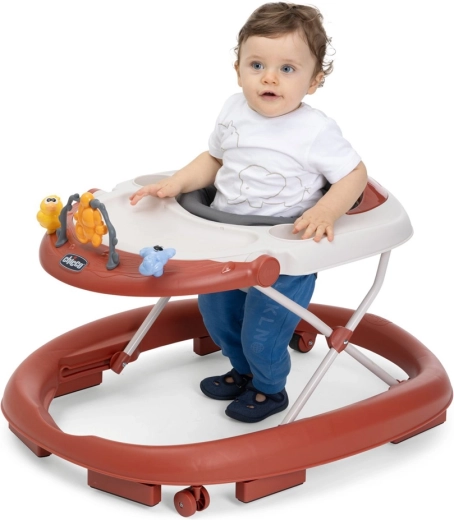 Il vassoio attività bianco con pannello di gioco e giochini supporta lo sviluppo sensoriale e motorio; non mancano i portabibite su entrambi i lati. Le ruote anteriori piroettanti facilitano le manovre, mentre le ruote antiscivolo e i fermi sono conformi alle norme di sicurezza europee. Dopo il gioco, il girello si chiude facilmente in formato compatto per un comodo stoccaggio e trasporto.