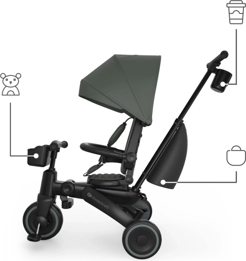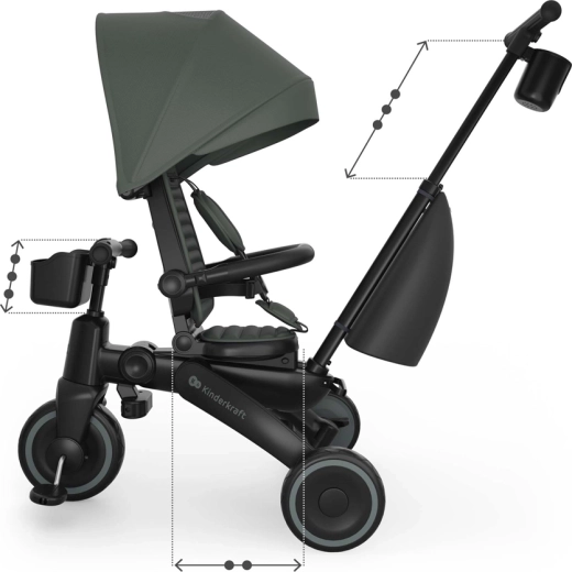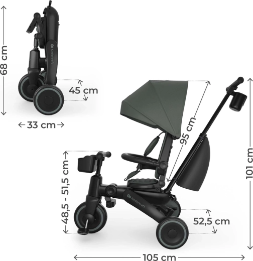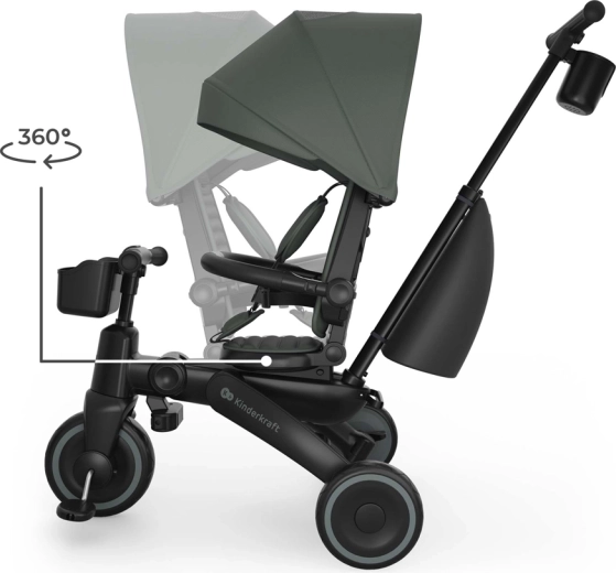 Il telaio pieghevole con doppia sicurezza garantisce una chiusura rapida e sicura in dimensioni compatte. Il triciclo può essere riposto stabilmente in posizione verticale o orizzontale, una comodità in casa, in ascensore e nel bagagliaio dell’auto. L’ampia capottina con filtro UPF 50+ e trattamento idrorepellente protegge dal sole e dalla pioggerellina; il pannello di ventilazione e la finestrella peek-a-boo migliorano il flusso d’aria e il contatto con il bambino.