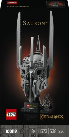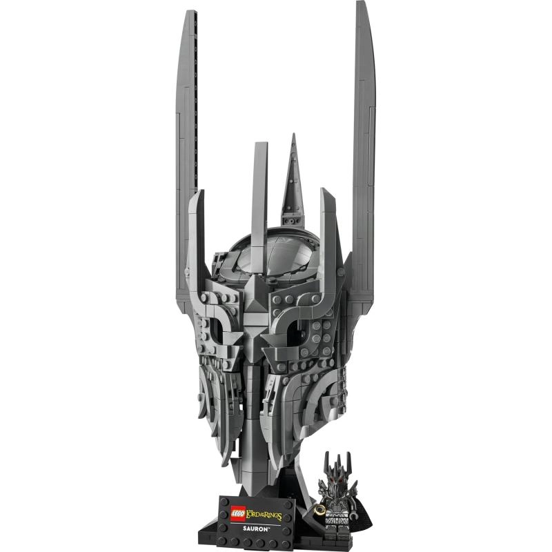 Set per costruire l’elmo, minifigure di Sauron con l’Anello del Potere, base da esposizione con targhetta