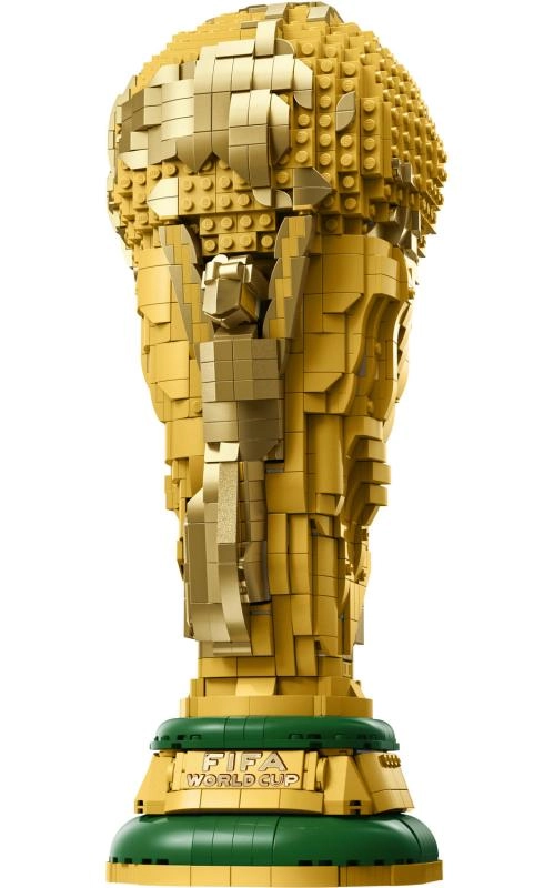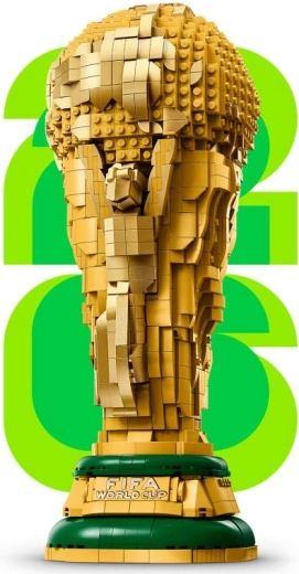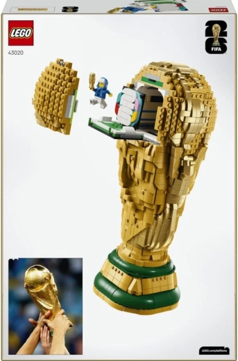 La parte superiore del trofeo si apre per rivelare un interno dettagliato con una minifigure che tiene un trofeo in miniatura e uno sfondo colorato con il logo della Coppa del Mondo FIFA 2026.