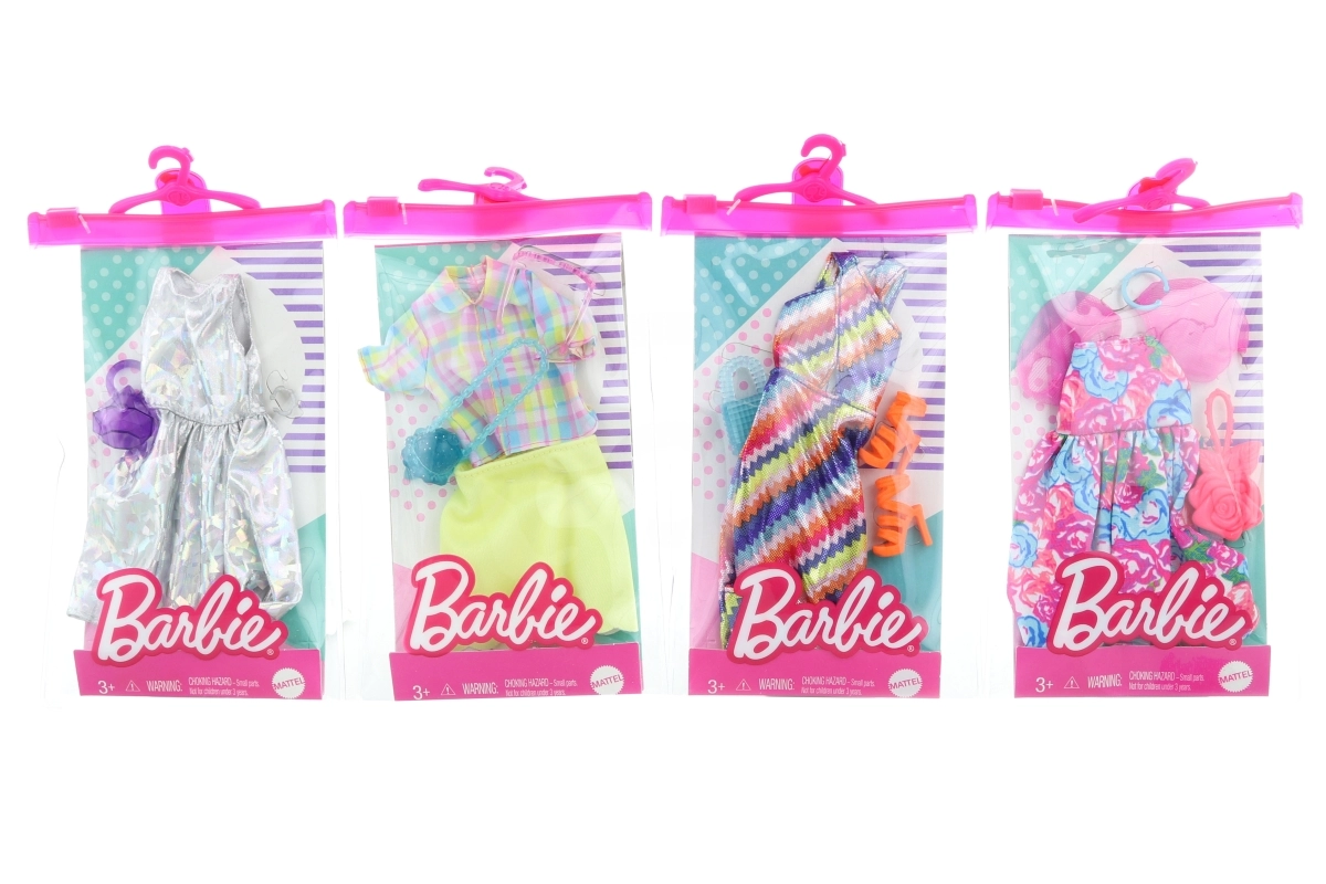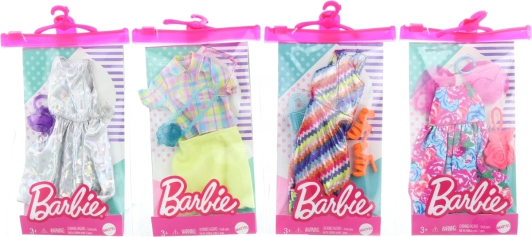 Gli abiti hanno un taglio universale, pensato per la maggior parte delle bambole Barbie standard. I singoli set sono venduti separatamente e possono variare per colori e aspetto in base alla disponibilità attuale. La bambola non è inclusa.