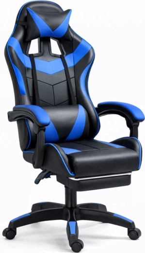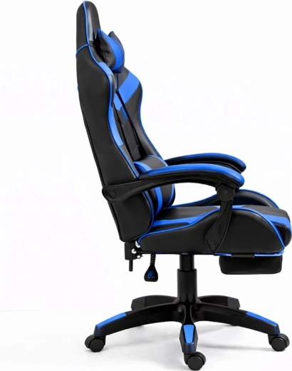 La sedia da gaming ergonomica LEAN in elegante combinazione nero‑blu offre schienale alto con poggiatesta e supporto lombare, schienale reclinabile fino a 135°, regolazione in altezza e poggiapiedi estraibile per il massimo comfort durante gioco e lavoro. La resistente ecopelle, la base girevole a 360° e la stabile base a cinque razze con ruote garantiscono comodità e facile mobilità anche nelle sedute prolungate.