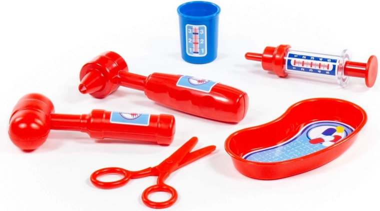 Divertente set del dottore per bambini con 6 strumenti di base (forbici, siringa, ciotola, otoscopio, martelletto riflessologico e misurino) che stimola la fantasia, l'empatia e aiuta a ridurre la paura dell'ambiente medico. Ideale per giocare a casa e con gli amici.