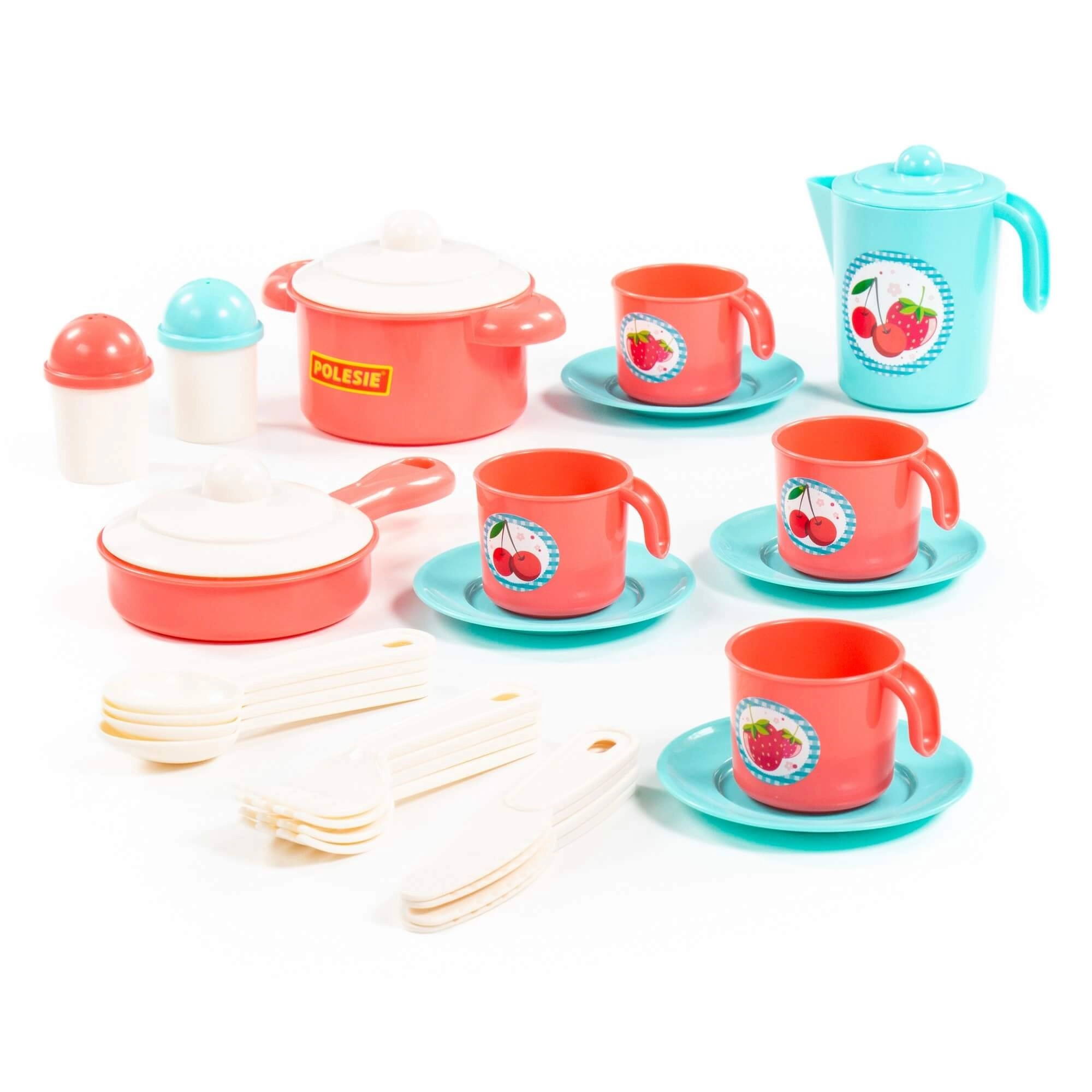 Con il set Nastenka i bambini vivono un gioco realistico di cucina e apparecchiatura. Il set include teiera, pentola con coperchio, padella con coperchio, tazzine con piattini, saliera e pepiera e un set di cucchiaini e utensili da cucina nei colori corallo e turchese con allegri motivi di frutta.