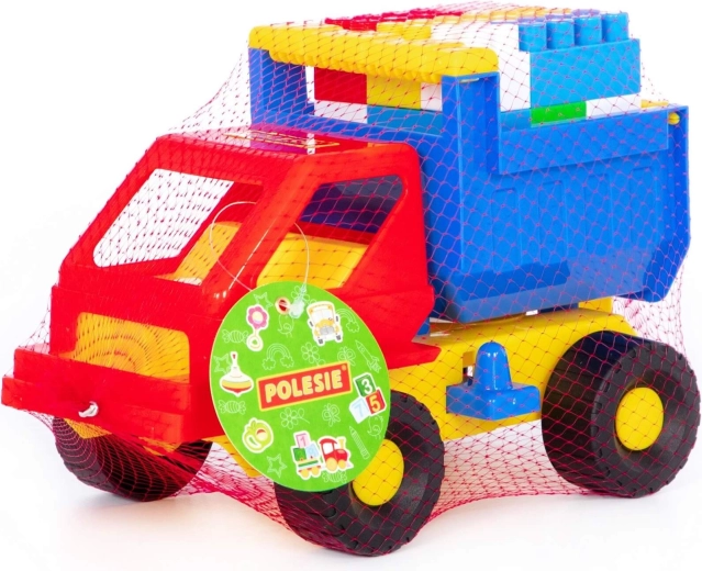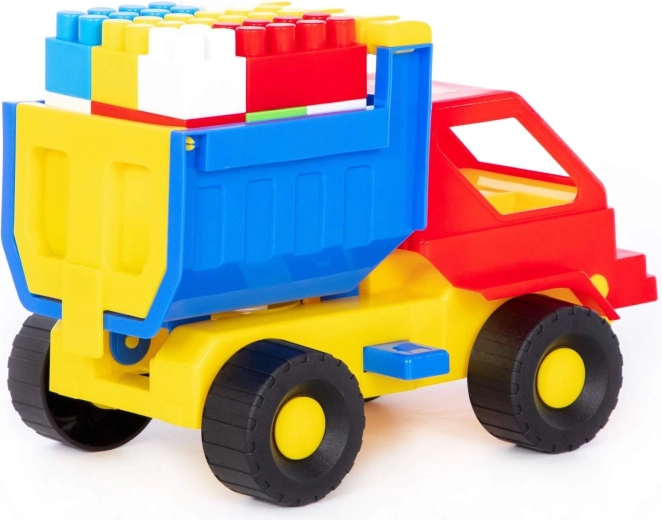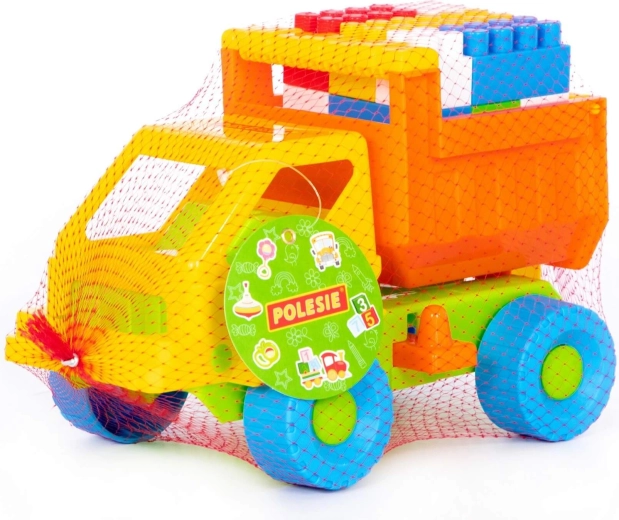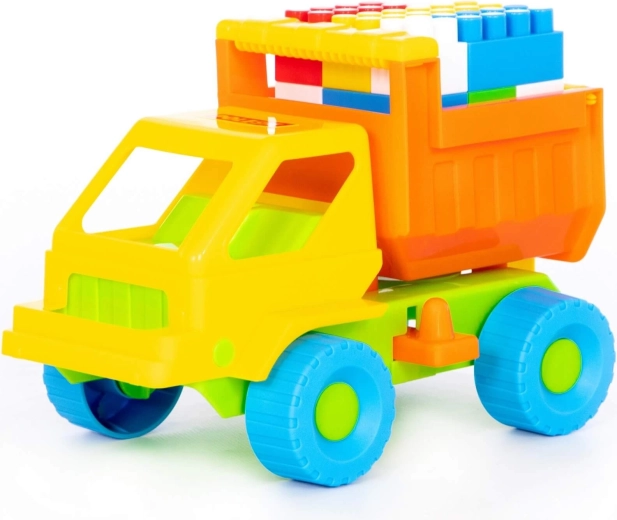 Il camion Kazimír è dotato di cassone ribaltabile, grazie al quale i bambini possono caricare e scaricare facilmente i mattoncini, proprio come in un vero cantiere.