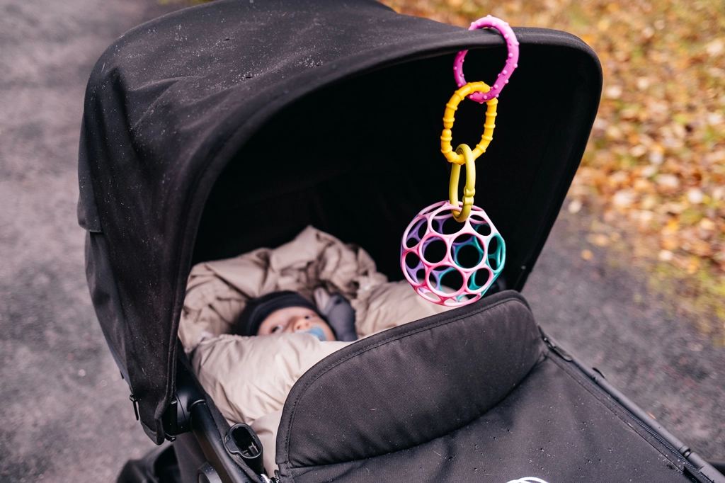 OBALL può essere facilmente fissata alla palestrina o al passeggino e intrattiene il bambino durante le passeggiate, il tummy time e il gioco sul tappetino.