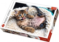 Questo puzzle di 1000 pezzi raffigura un gattino felice. Una volta assemblato, crea un'immagine di 68x48 cm. Garantisce alta qualità, colori brillanti e sicurezza del montaggio grazie alla carta calandrata che respinge la luce e ai colori alimentari ecologici.