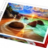 Il puzzle offre una veduta pittoresca della spiaggia con un drammatico tramonto, onde del mare e rocce.