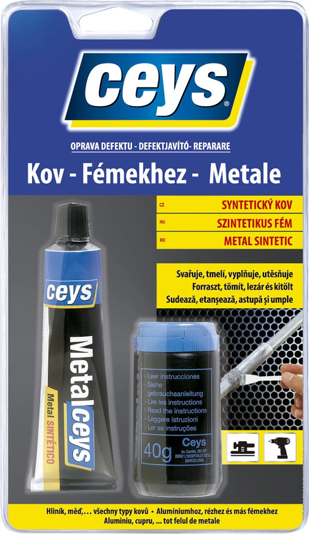 Stucco bicomponente CEYS con carica metallica per riparazioni rapide e durature dei metalli. Saldatura a freddo (es. alluminio, rame), sigilla, unisce e riempie le crepe. Crea un film protettivo anticorrosione, è resistente ad acidi, detergenti e minerali e, una volta indurito, può essere levigato, forato, lucidato e verniciato.