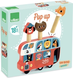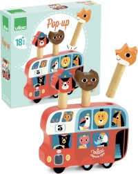 Gioco d'Autobus a Molla in Legno con Animali di Vilac è un bellissimo giocattolo con illustrazioni dell'artista nota Ingela P. Arrhenius. Tre simpatici personaggi - volpe, cagnolino e gattino - saltano fuori dall'autobus, assicurando il divertimento dei bambini.