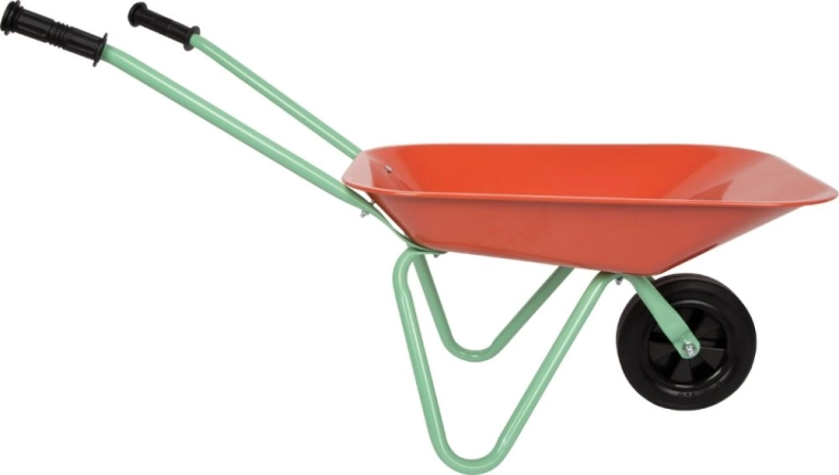 Vasca in metallo stabile, telaio resistente e impugnature ergonomiche permettono ai bambini di trasportare comodamente terra, foglie o attrezzi in giardino.