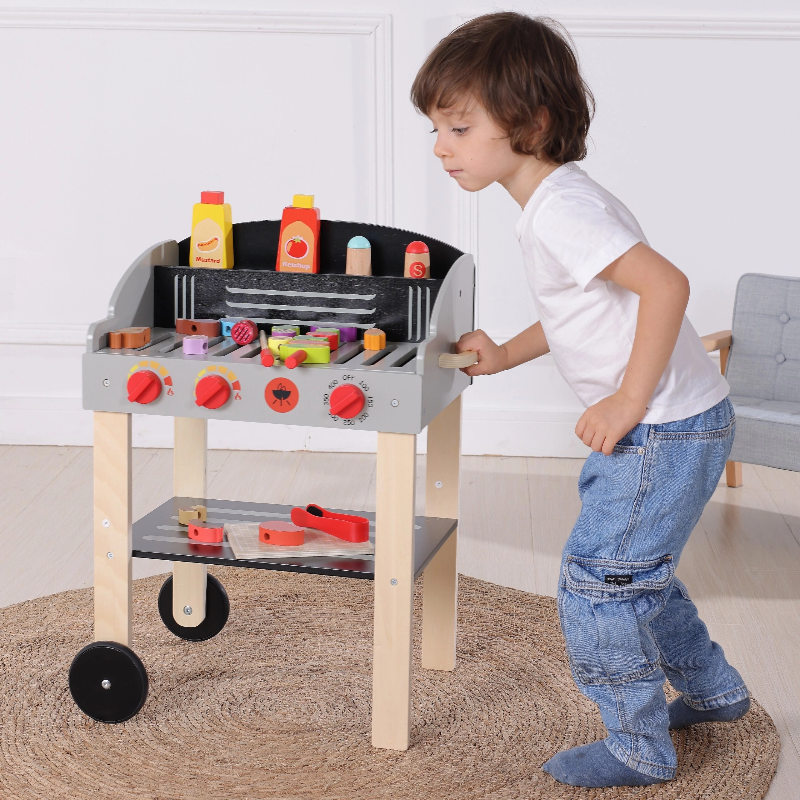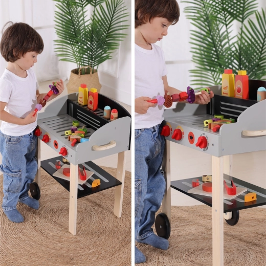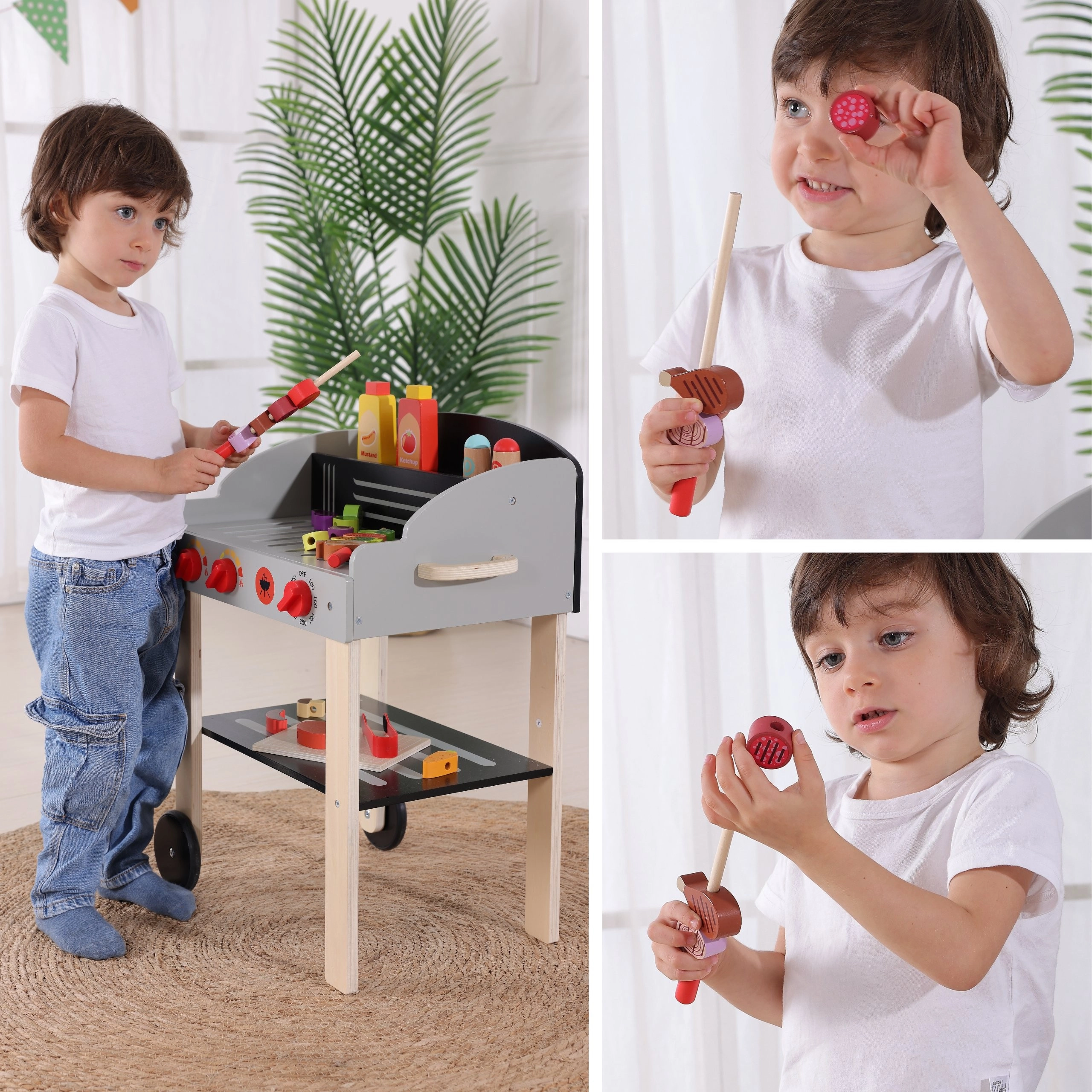 Scopri la gioia di giocare al piccolo chef con il bellissimo barbecue WOOPIE in legno su ruote. Questo set di qualità in legno robusto con manopole girevoli, coperchio apribile e mensola inferiore entusiasmerà i bambini dai 3 anni in su. Il ricco set di accessori, inclusi spiedini, verdure e carne, ketchup e senape, saliera e pepiera e pinze, favorisce il gioco creativo, lo sviluppo della motricità fine e un approccio sicuro alla preparazione dei pasti.