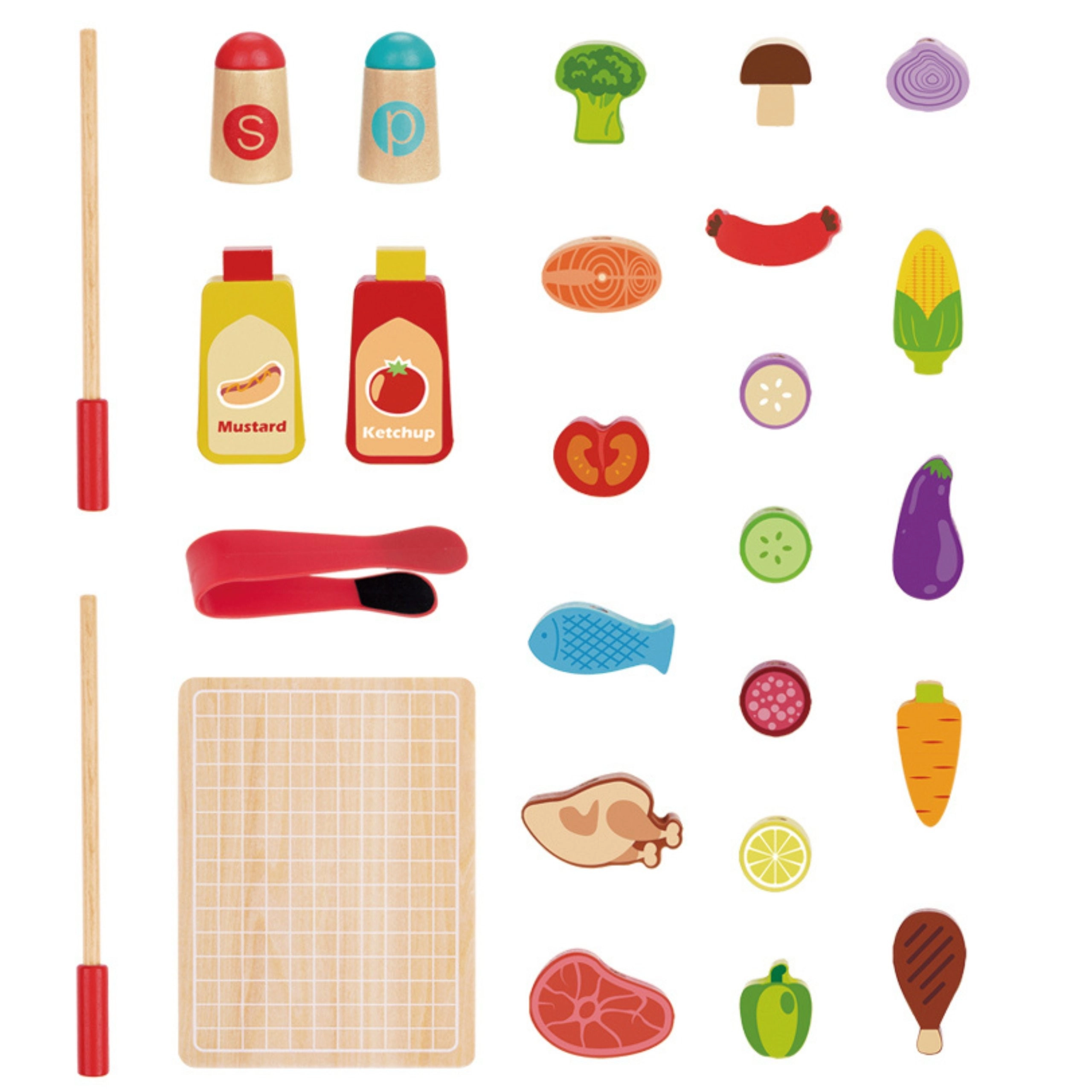 - 2× spiedino, alimenti in legno (carne, verdura, funghi), pinze, tagliere, ketchup, senape, saliera, pepiera