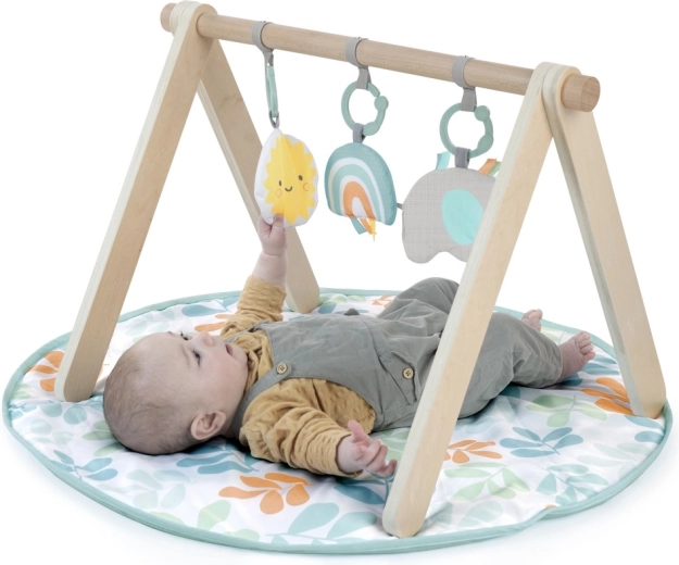 Elegante tappeto gioco con solido arco in legno a forma di A che offre al bebé uno spazio sicuro e confortevole per esplorare. Tre giochi sospesi – arcobaleno in peluche con campanellino, sole con specchietto e dolce elefantino – favoriscono lo sviluppo sensoriale, la motricità fine e la coordinazione occhio–mano. Il morbido tappetino imbottito in colori neutri si adatta a qualsiasi interno e si può lavare in lavatrice.