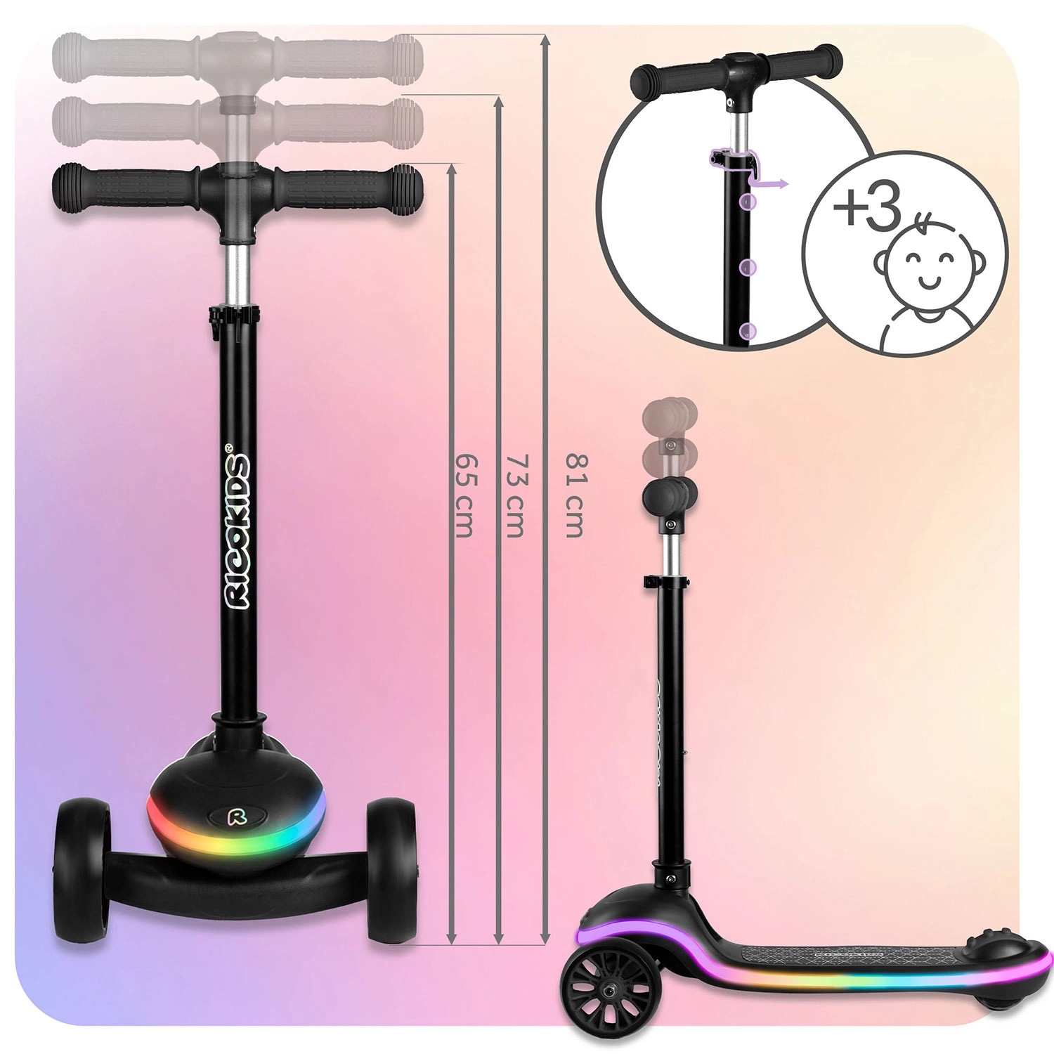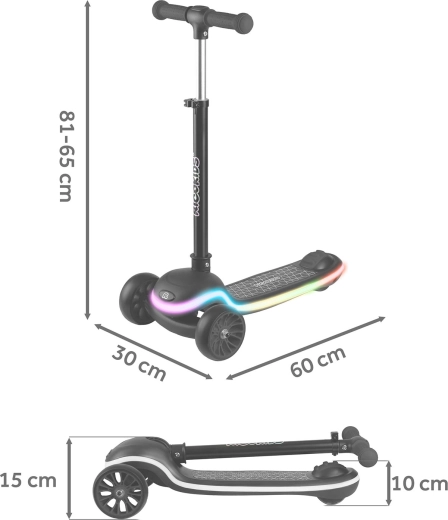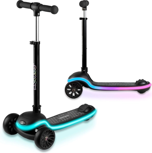 Dai il via al divertimento con il monopattino Ricokids Leddi! Struttura leggera e maneggevole, design stabile a tre ruote e piattaforma illuminata con 20 modalità LED garantiscono una guida sicura e uno spettacolo di luci dopo il tramonto. Chiusura rapida con un solo gesto, manubrio ad altezza regolabile e superficie antiscivolo rendono questo monopattino la scelta ideale per bambini dai 3 anni in su.