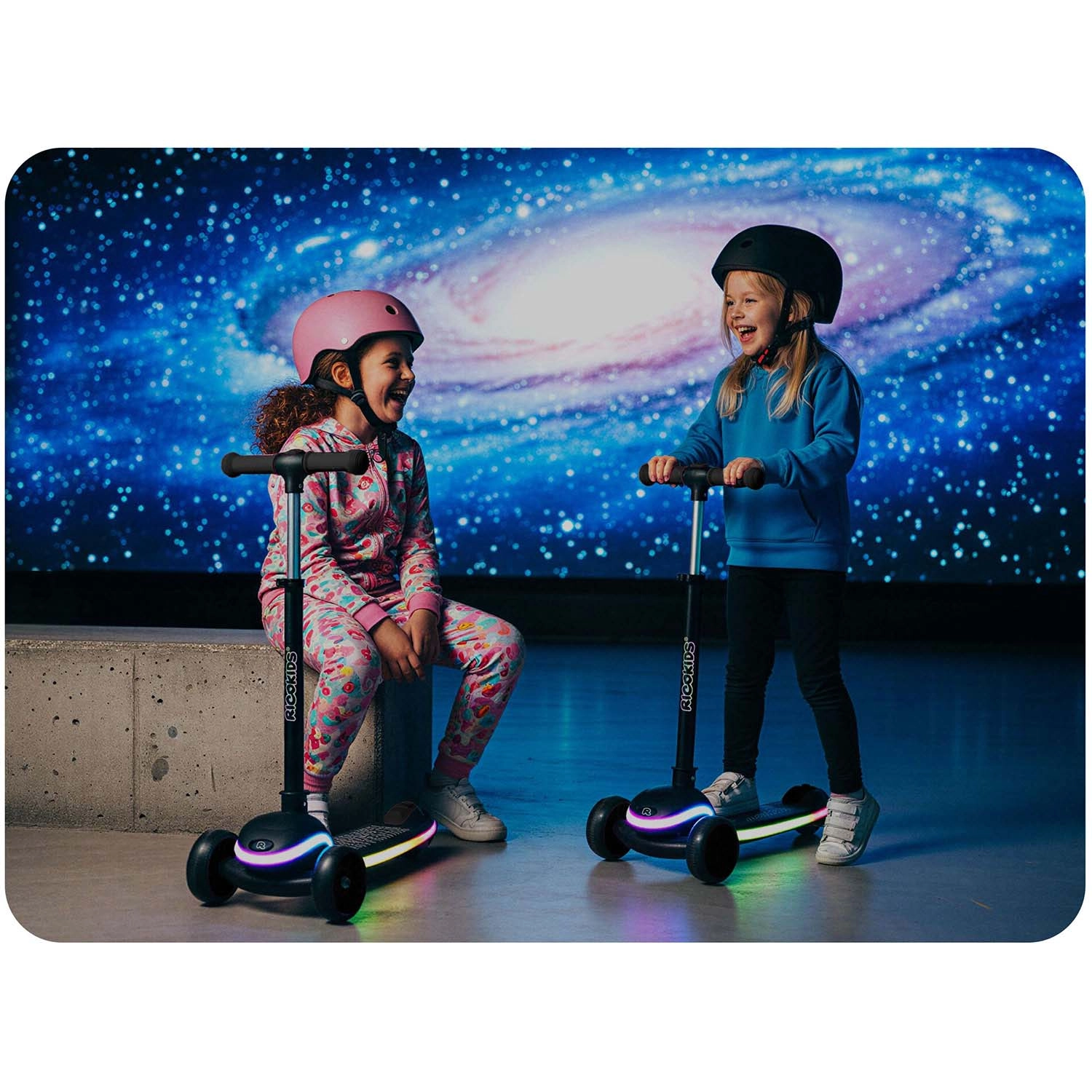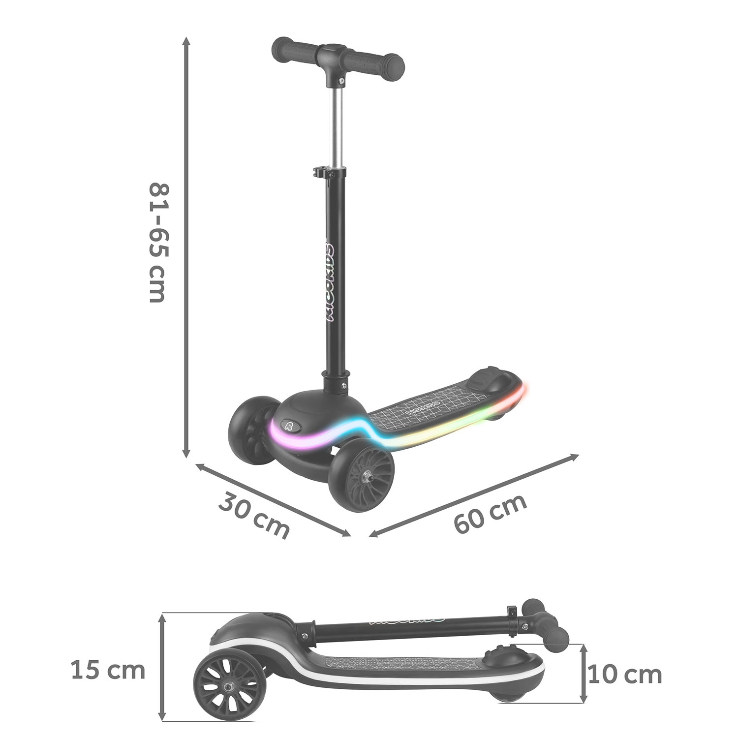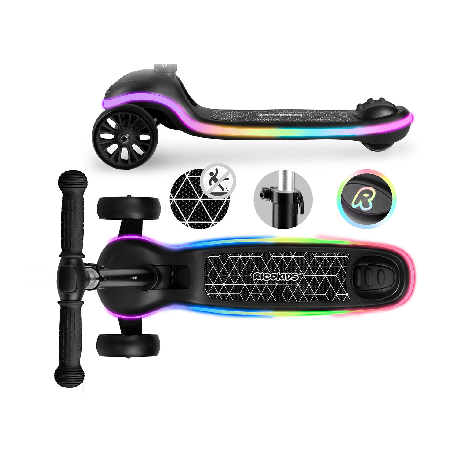 Ricokids Leddi unisce design moderno, lavorazione di qualità e sicurezza. Le due ruote anteriori aumentano la stabilità, il piano d’appoggio antiscivolo e i grip garantiscono una presa sicura e il freno a pedale facilita il controllo della velocità. La piattaforma illuminata con 20 modalità offre effetti monocromatici e multicolori con transizioni fluide, ideale per visibilità e divertimento.