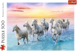 Puzzle contenente 500 pezzi che mostrano la bellezza e l'eleganza dei cavalli bianchi in piena corsa. Componendo questo puzzle, otterrete un'immagine delle dimensioni di 48x34 cm.