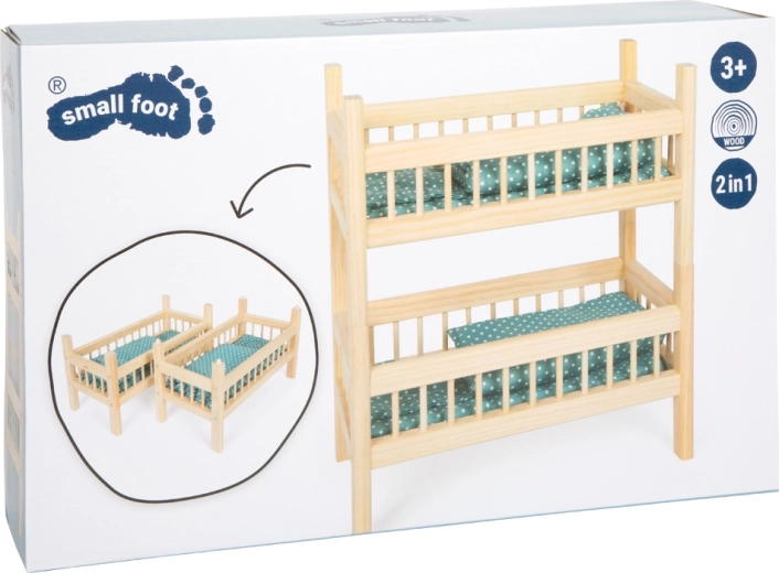 Il letto in legno universale per bambole SMALL FOOT è la scelta ideale per giochi creativi dei bambini. Grazie alla lavorazione di qualità e all’aspetto naturale, si inserisce perfettamente in qualsiasi cameretta. Il concetto 2 in 1 consente di utilizzare il letto come letto a castello per il doppio del divertimento, oppure di dividerlo in due lettini per giocare con più bambole contemporaneamente.