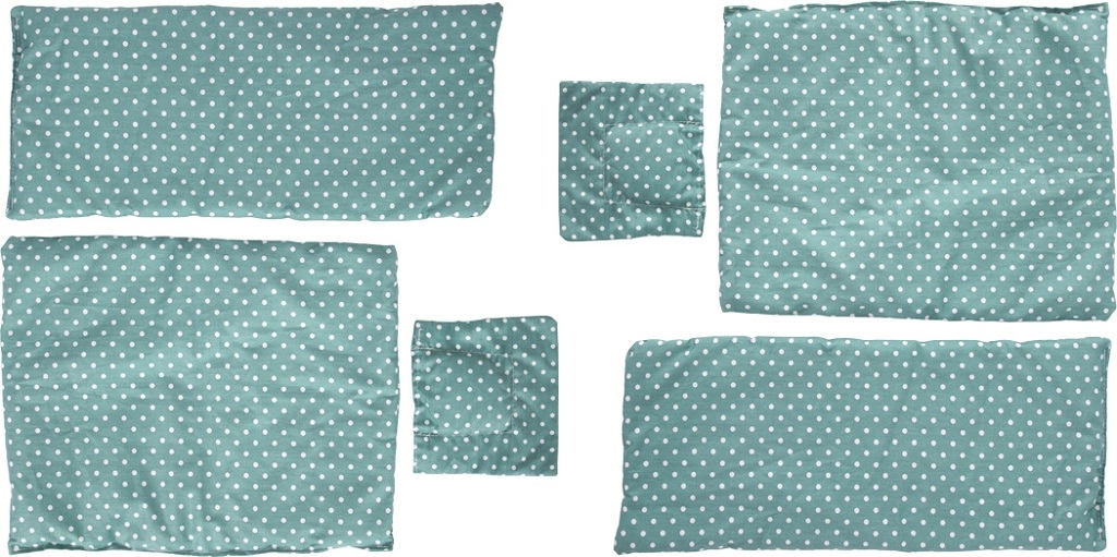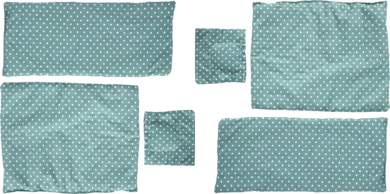 La confezione include morbidi cuscini, coperte e lenzuola coordinati con un motivo a pois.