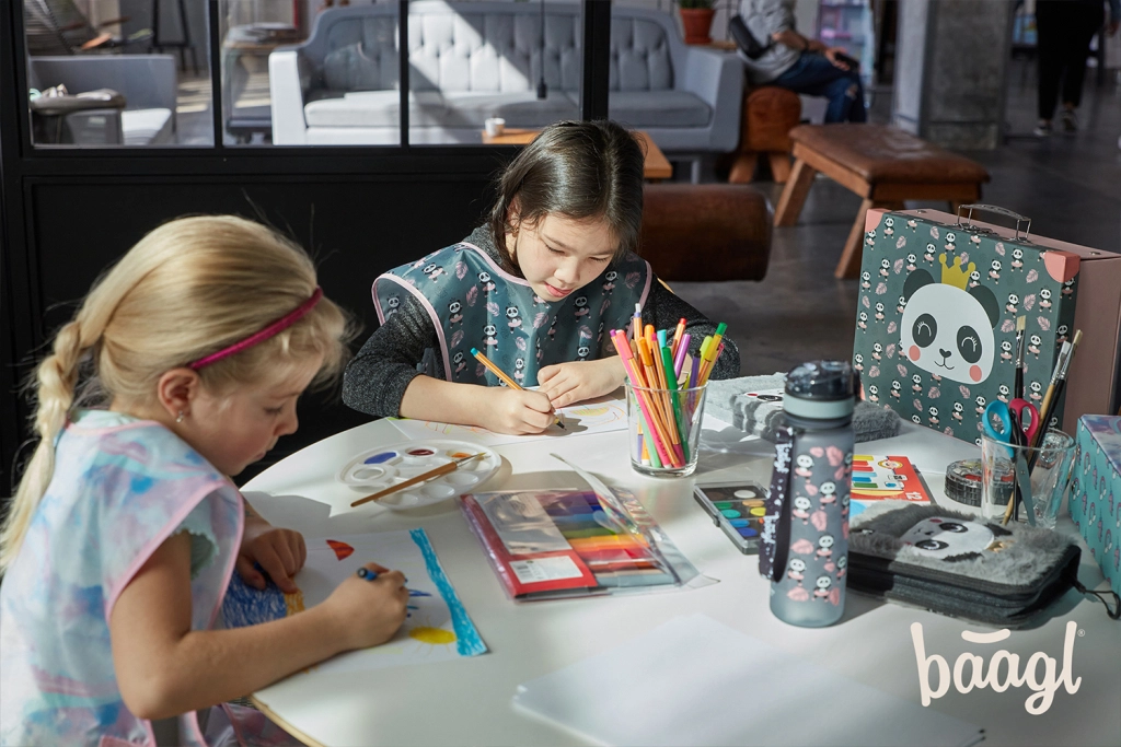 Accessori pratici coordinati nel popolare design panda semplificano ogni giornata di scuola. L’astuccio a due ribalte conserva il materiale di scrittura, la sacca con tasca contiene le scarpe di ricambio o l’abbigliamento per ginnastica e il grembiule protegge i vestiti durante le attività artistiche. Il portamonete da collo con chiusura di sicurezza custodisce spiccioli, badge o chiavi.